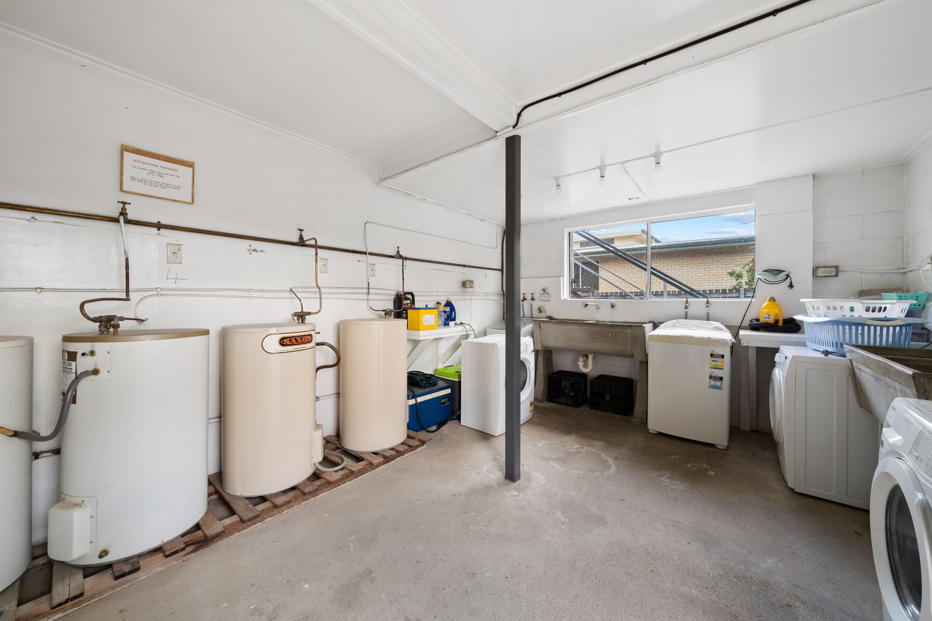 > The communal laundry located at the back of the building on the lower-level features concrete washtubs, sliding windows, hot water systems, and access to the storage area.