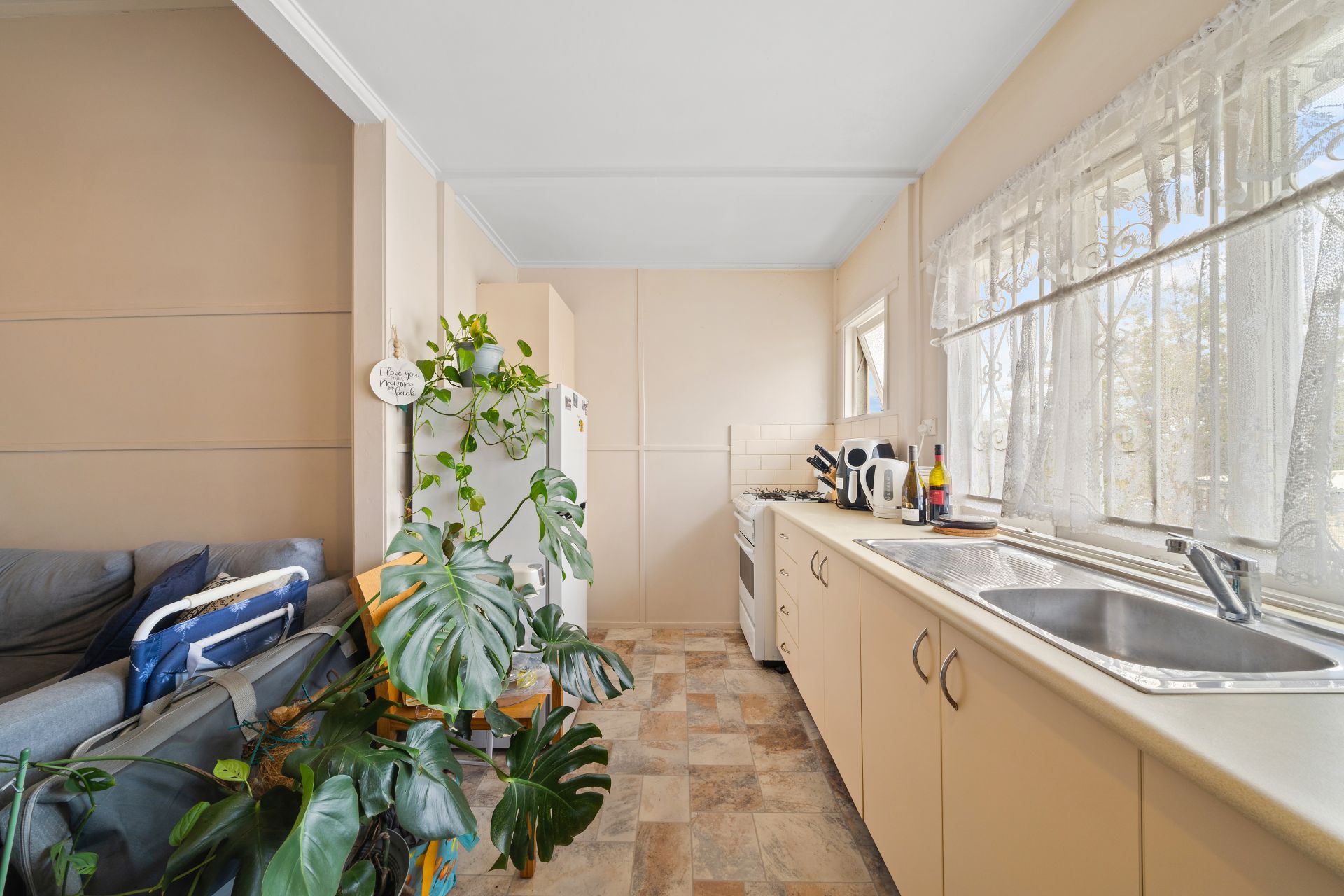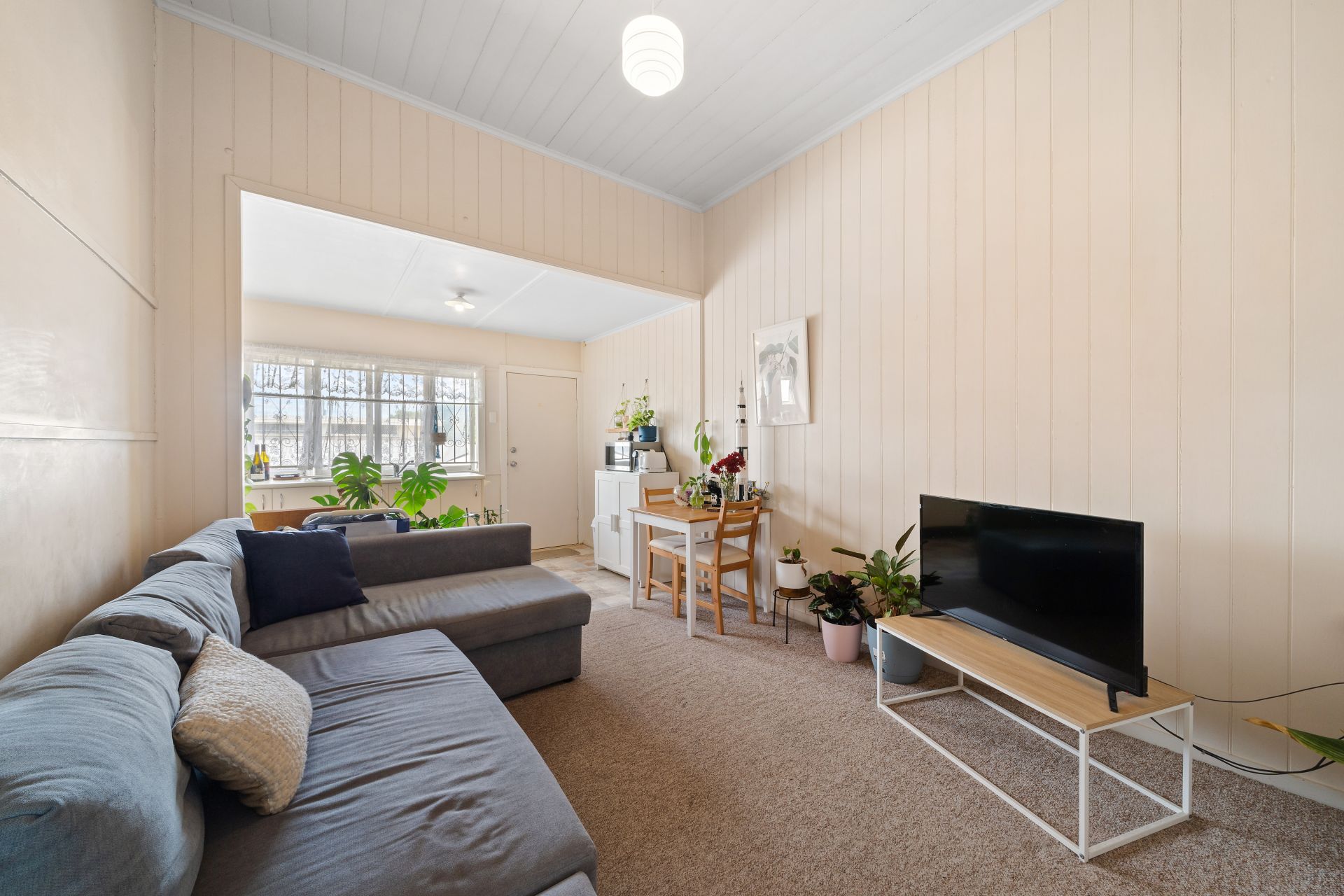 > The open living area flows located at the heart flows effortlessly from the entrance to the kitchen area and out to the yard. Featuring carpet flooring, pendant lighting, VJ panelling, and linen cupboard.