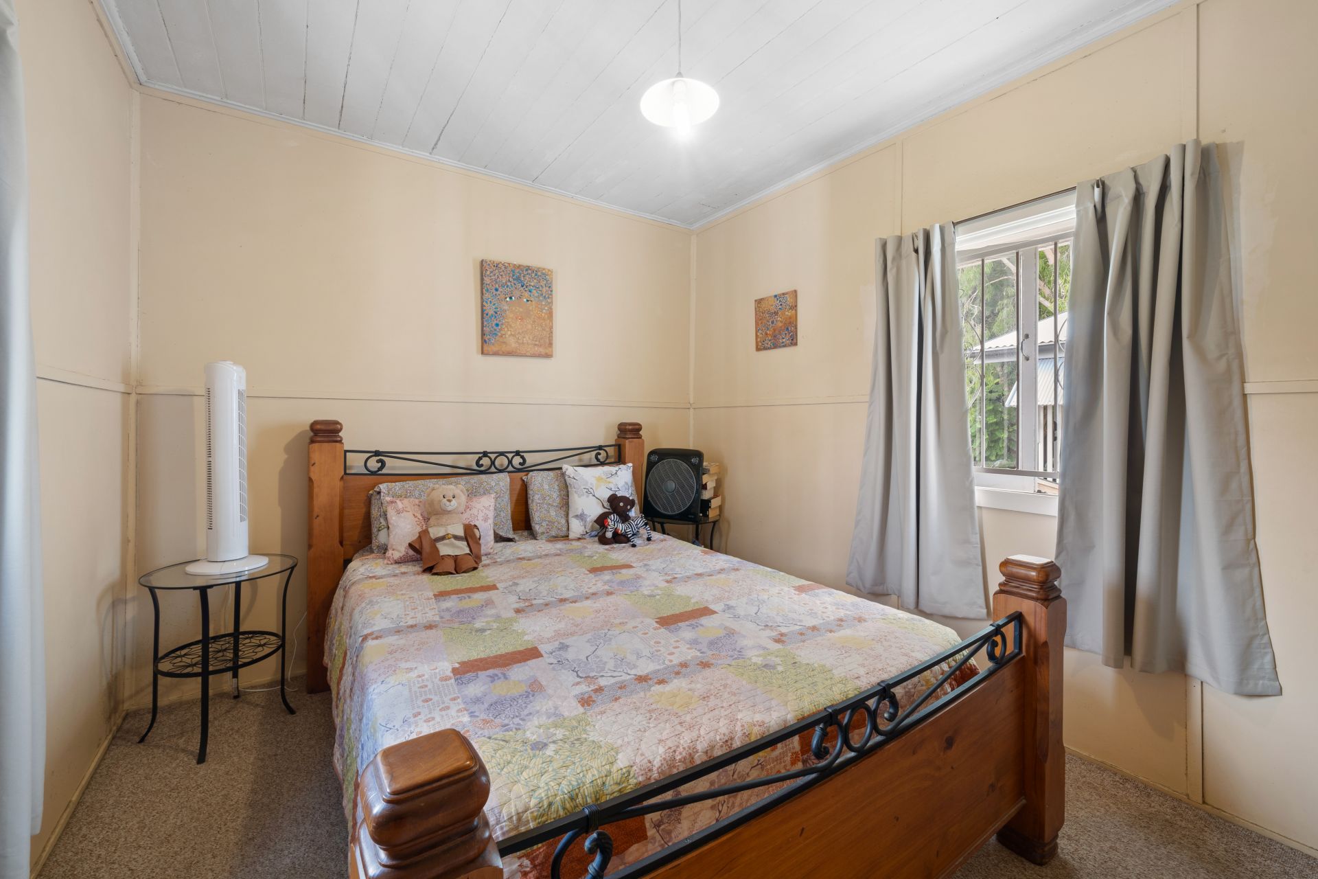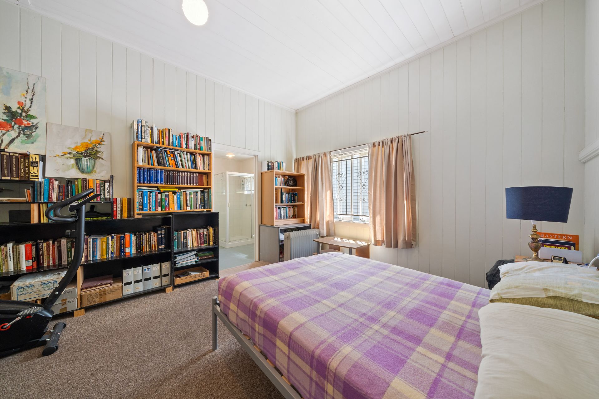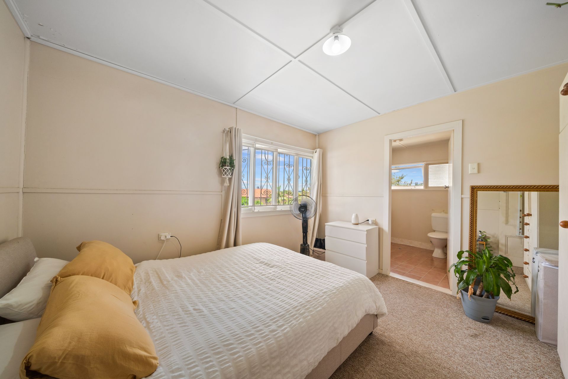 > The spacious king-sized room features extra-high ceilings, carpet flooring, VJ panelling, picture railing, wardrobe, pendant lighting, casement windows, security bars, curtains and ensuite.