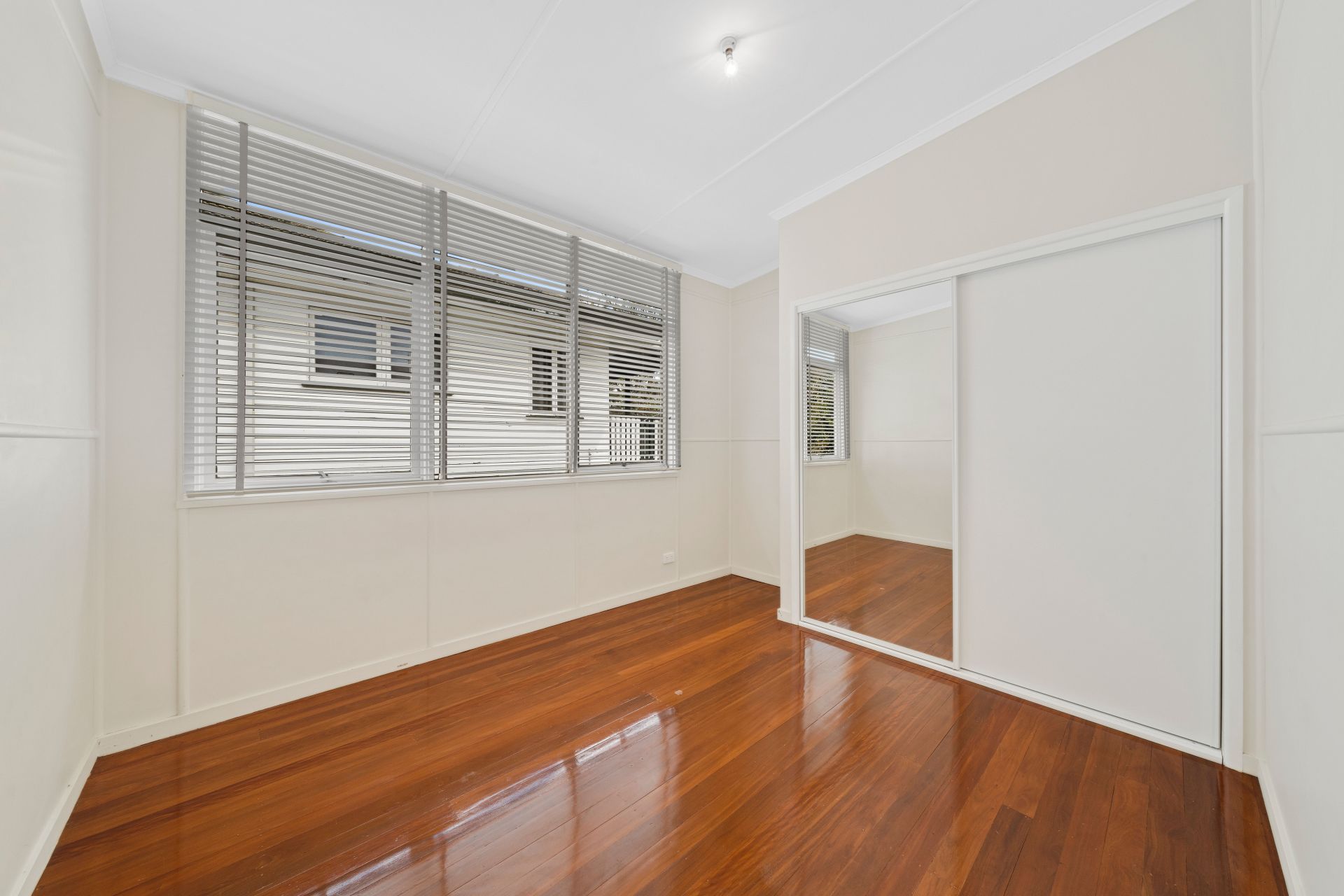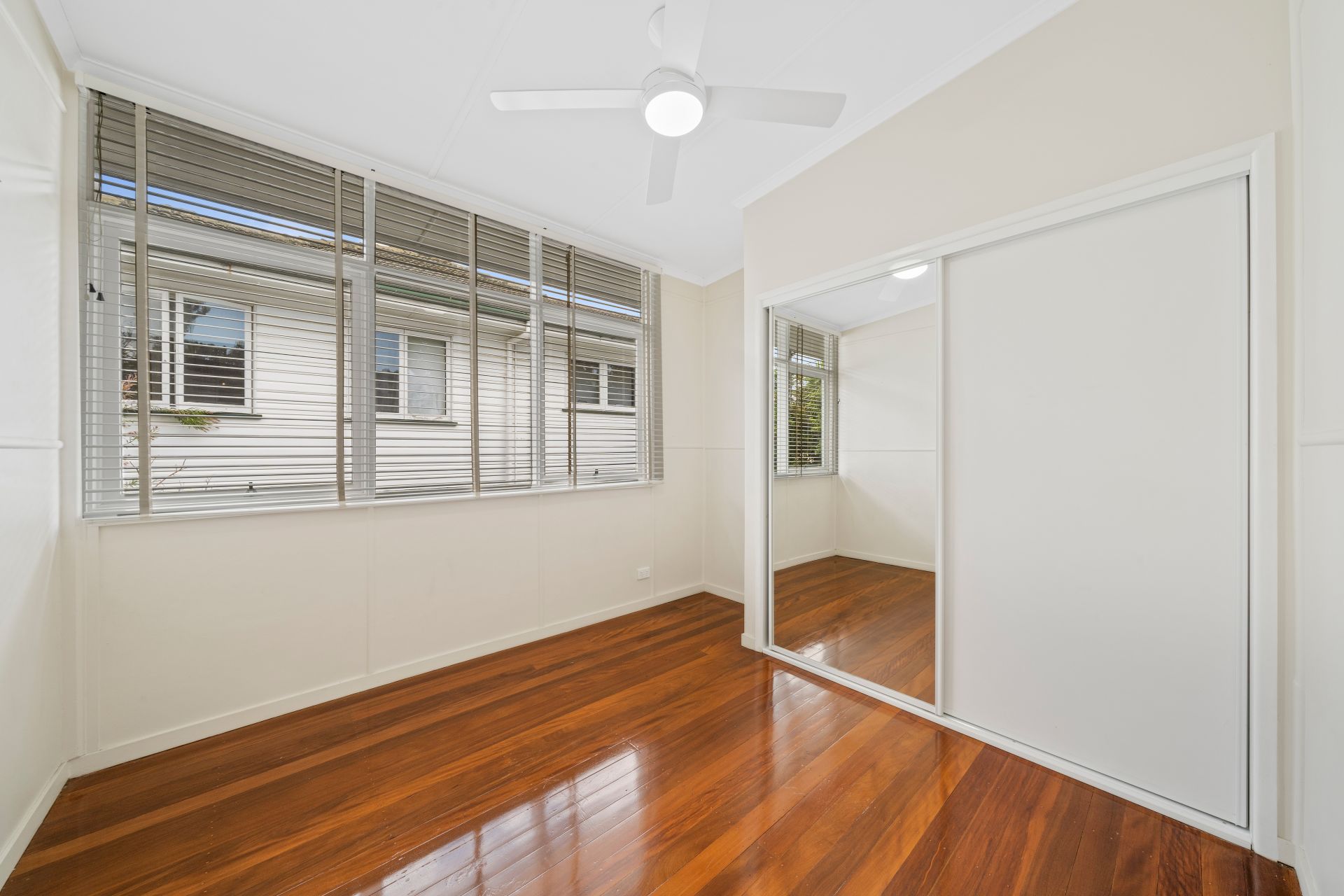 > A light-filled master bedroom with a split-system air conditioner, polished timber floors, built-in wardrobe, ceiling fan & blinds
