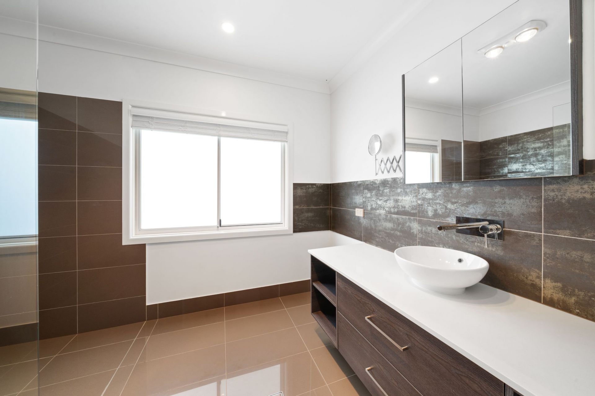 The air-conditioned main bedroom offers a walk-in wardrobe with custom shelving as well as an ensuite (who doesn't love a double vanity?).
