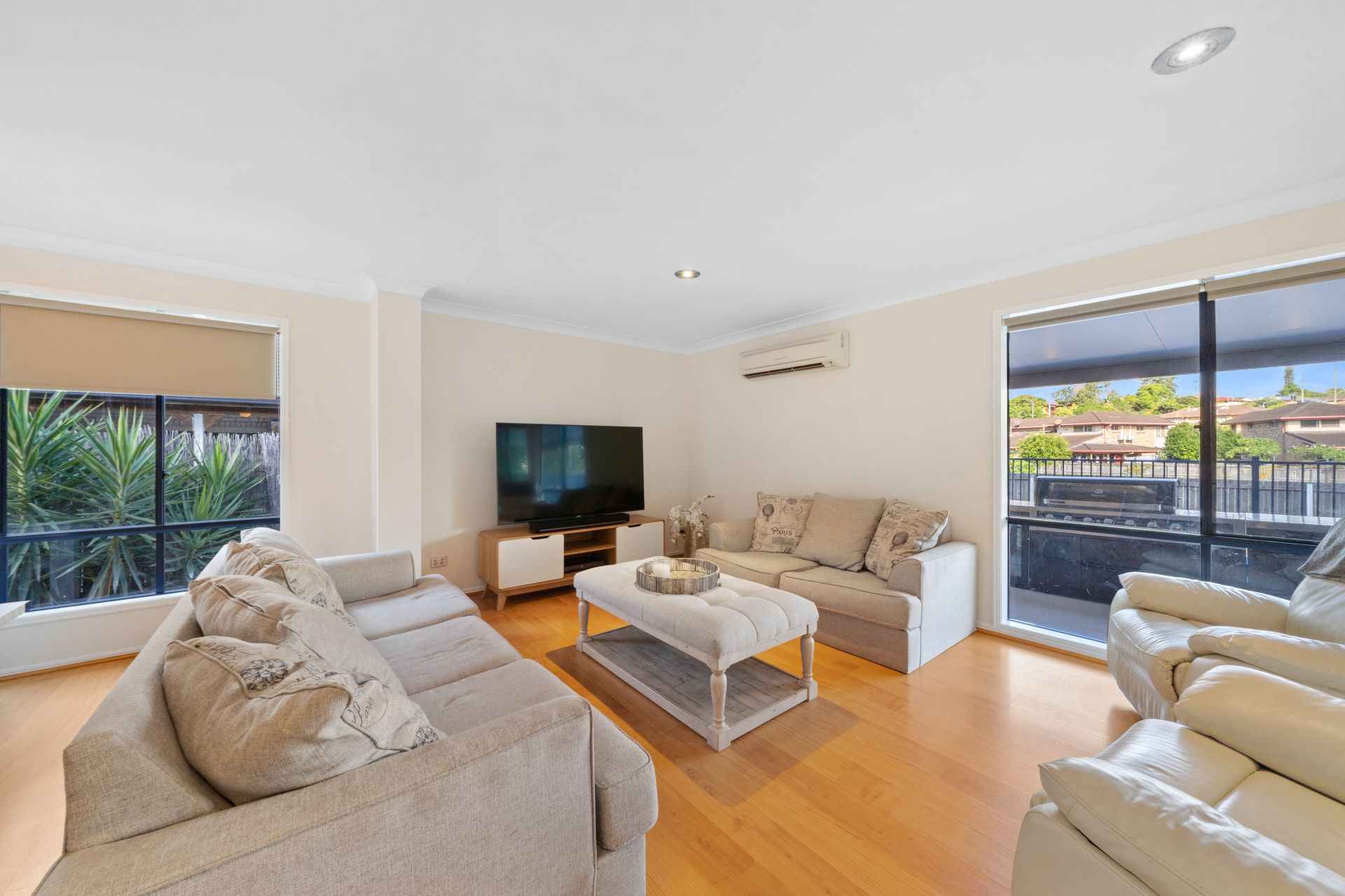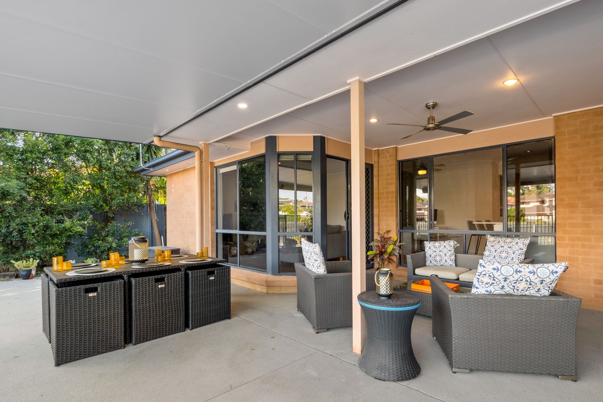 > The open plan lounge/dining areas located at the back of the house features air-conditioning, floating timber flooring, pendant as well as down lighting, ceiling fan with in-built lighting, roller blinds, sliding windows and doors with fly screens, and security grilles giving you access to outdoor entertaining area and yard.