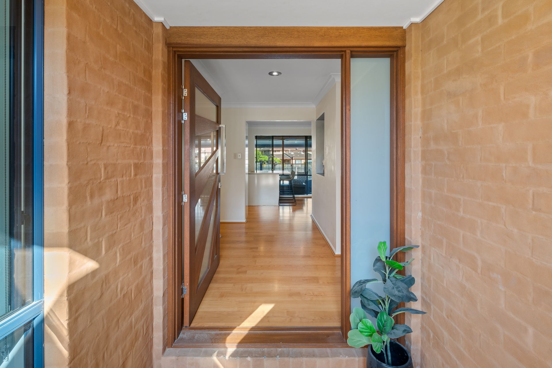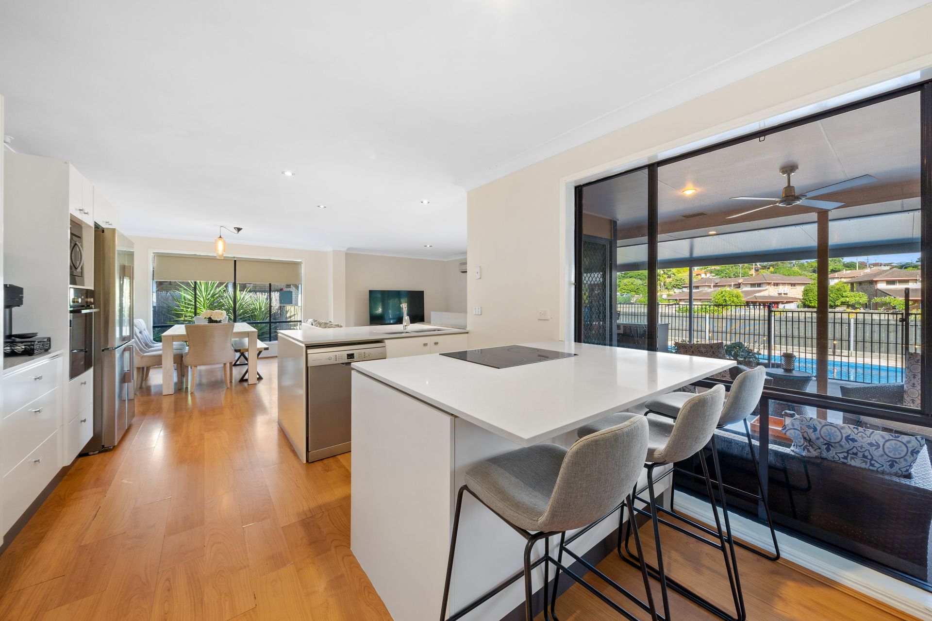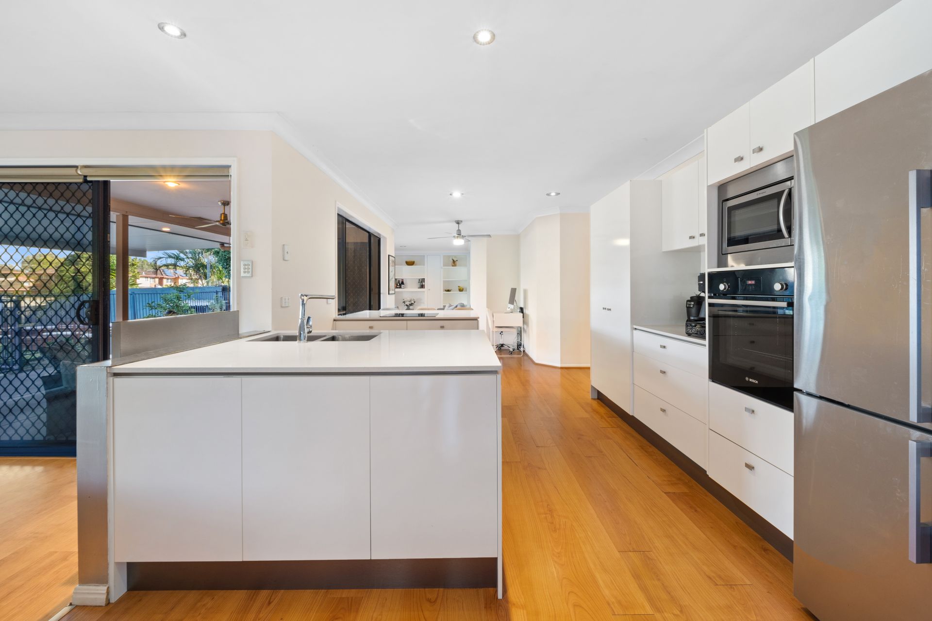 > The family room located at the rear of the home flows effortlessly from the kitchen and through to the outdoor entertaining area. The light and contemporary colour scheme adds to the expansive nature of the home featuring floating timber flooring, ceiling fan with in-built lighting, down lighting, custom cabinetry, sliding windows and doors with fly screens, and security grilles.