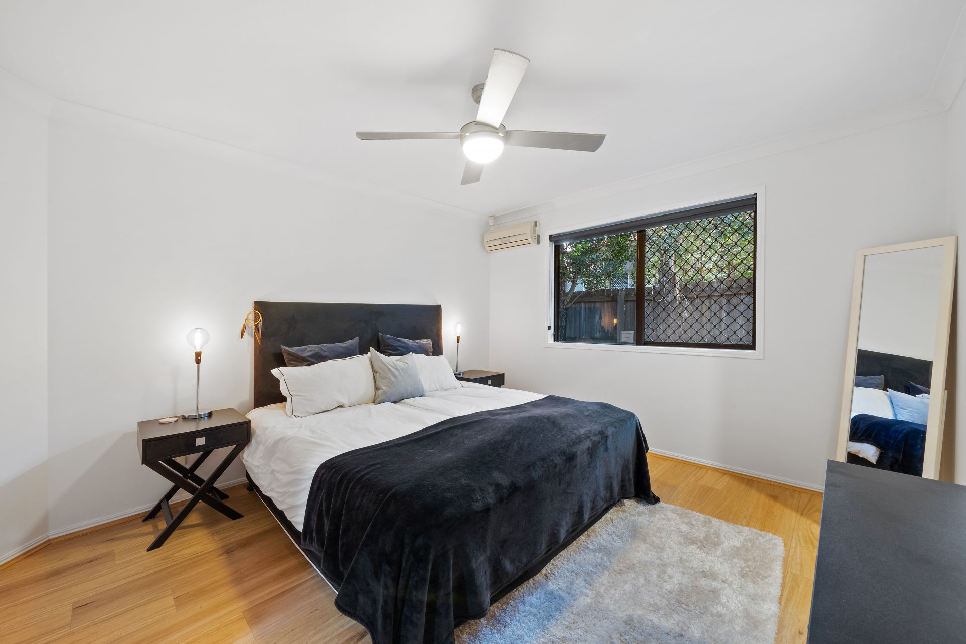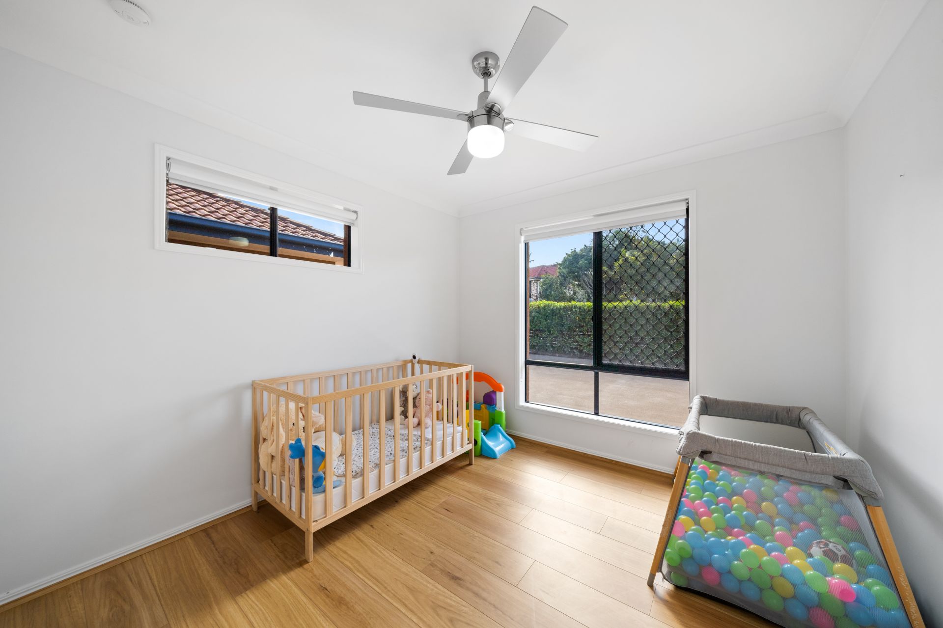 > Bedrooms 2 & 3 boast floating timber flooring, ceiling fan with in-built lighting, built-in robes, sliding window with security and fly screens and roller blinds.