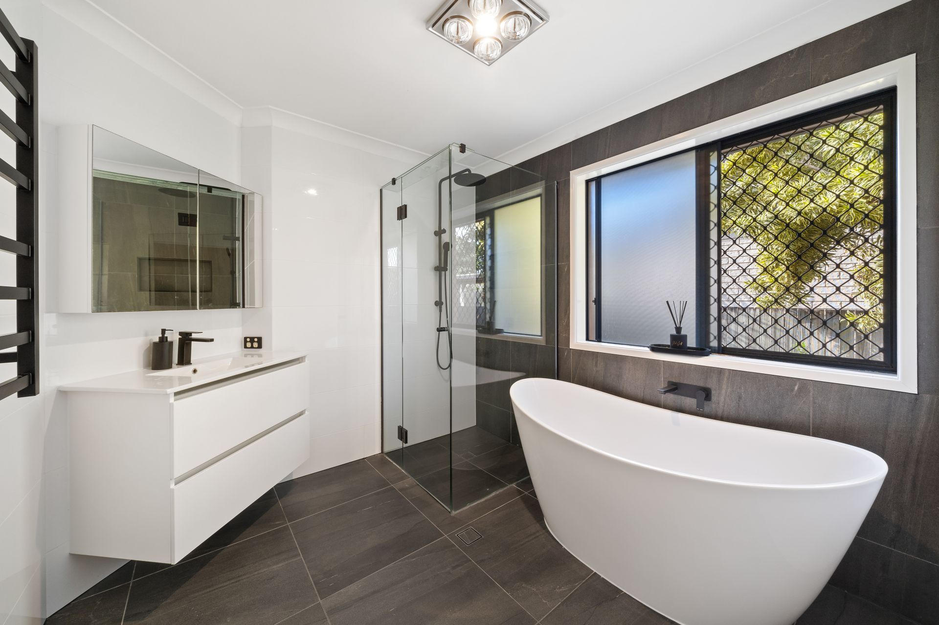 > The main bathroom features floor-to-ceiling chic tiles, a shower with dual shower heads (detachable and monsoon), separate bath configuration, single floating vanity with storage, mirror fronted vanity cabinet, extractor/light combo, towel rail, custom black tapware, sliding window with security screens and separate toilet.