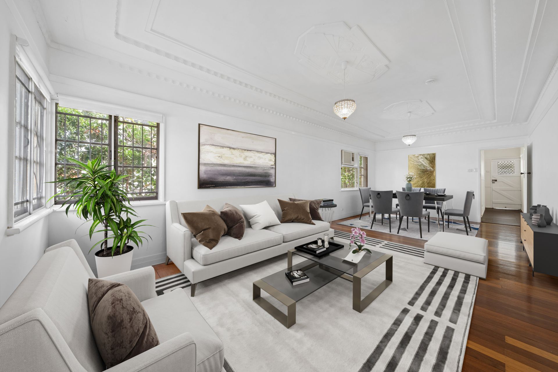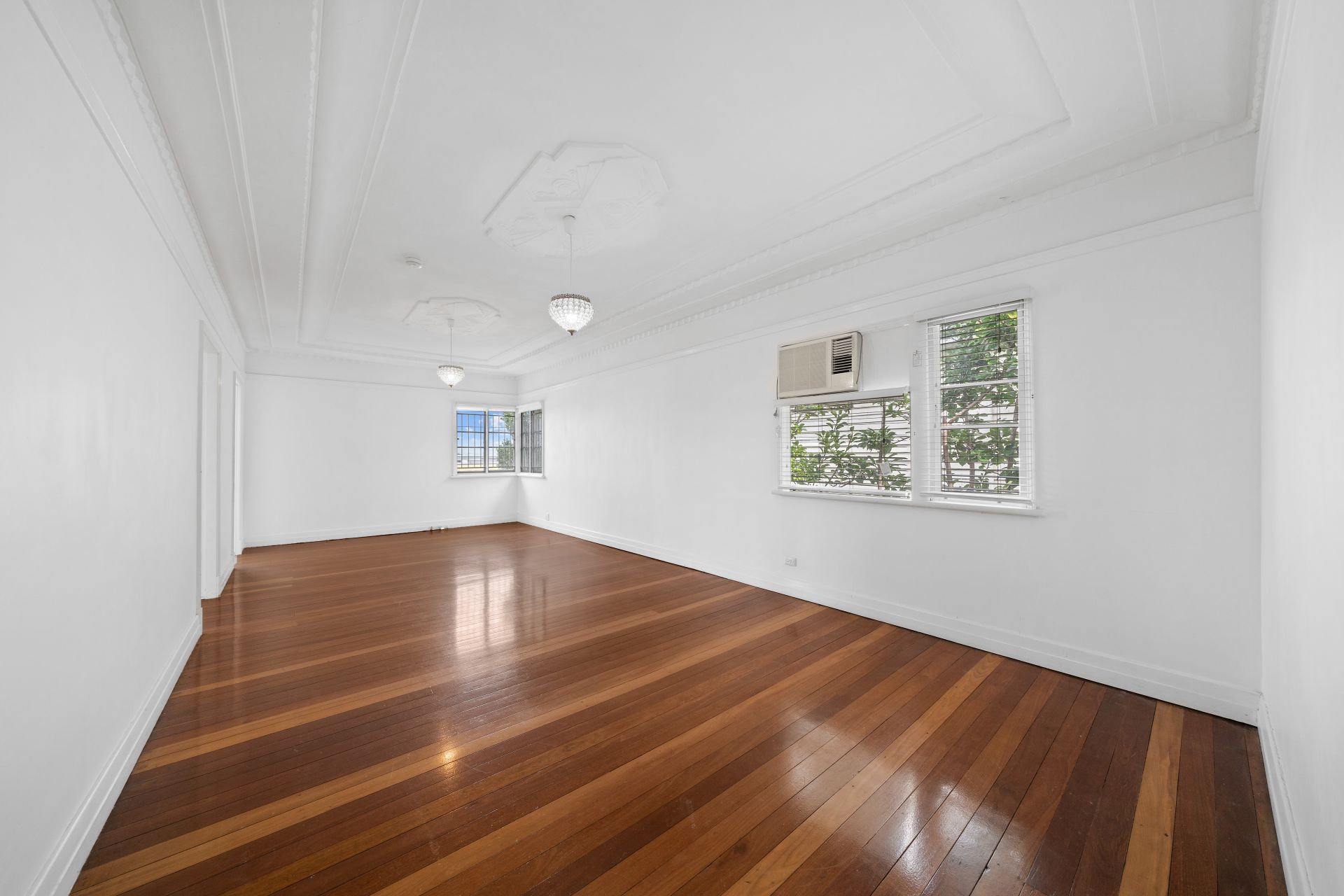> Large lounge room offers polished timber floors, ornate ceilings and cornice, pendant lighting, casement and fixed windows, venetian and roller blinds, fly screens, security bars and a wall mounted box air-conditioner.