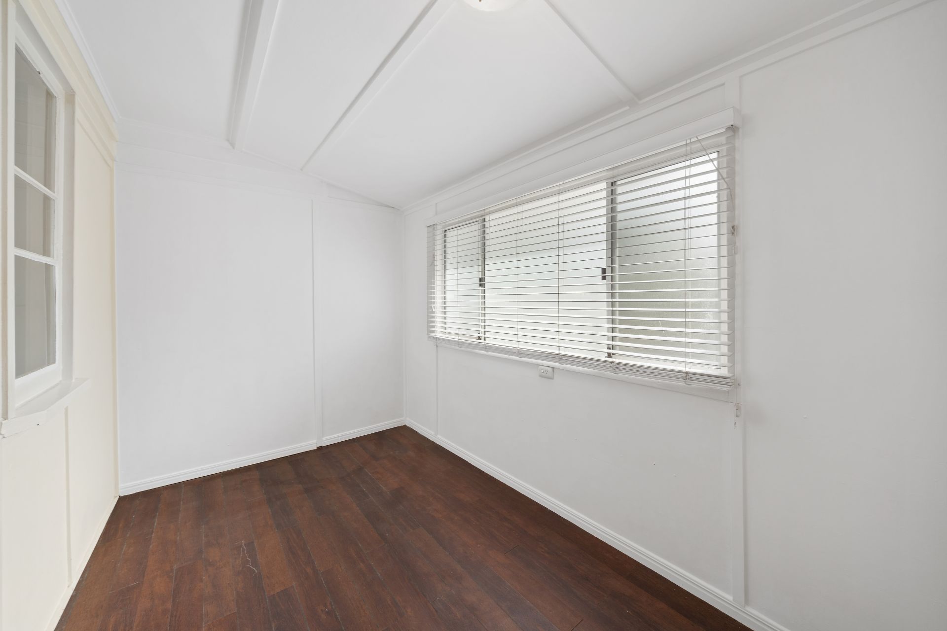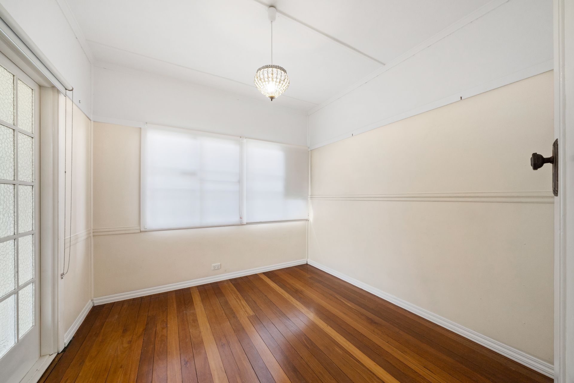 > Bedroom 3 offers extra-high ceilings, polished timber floors, pendant lighting, dado railing, casement windows, fly screens, roller blinds and French doors opening to the study.