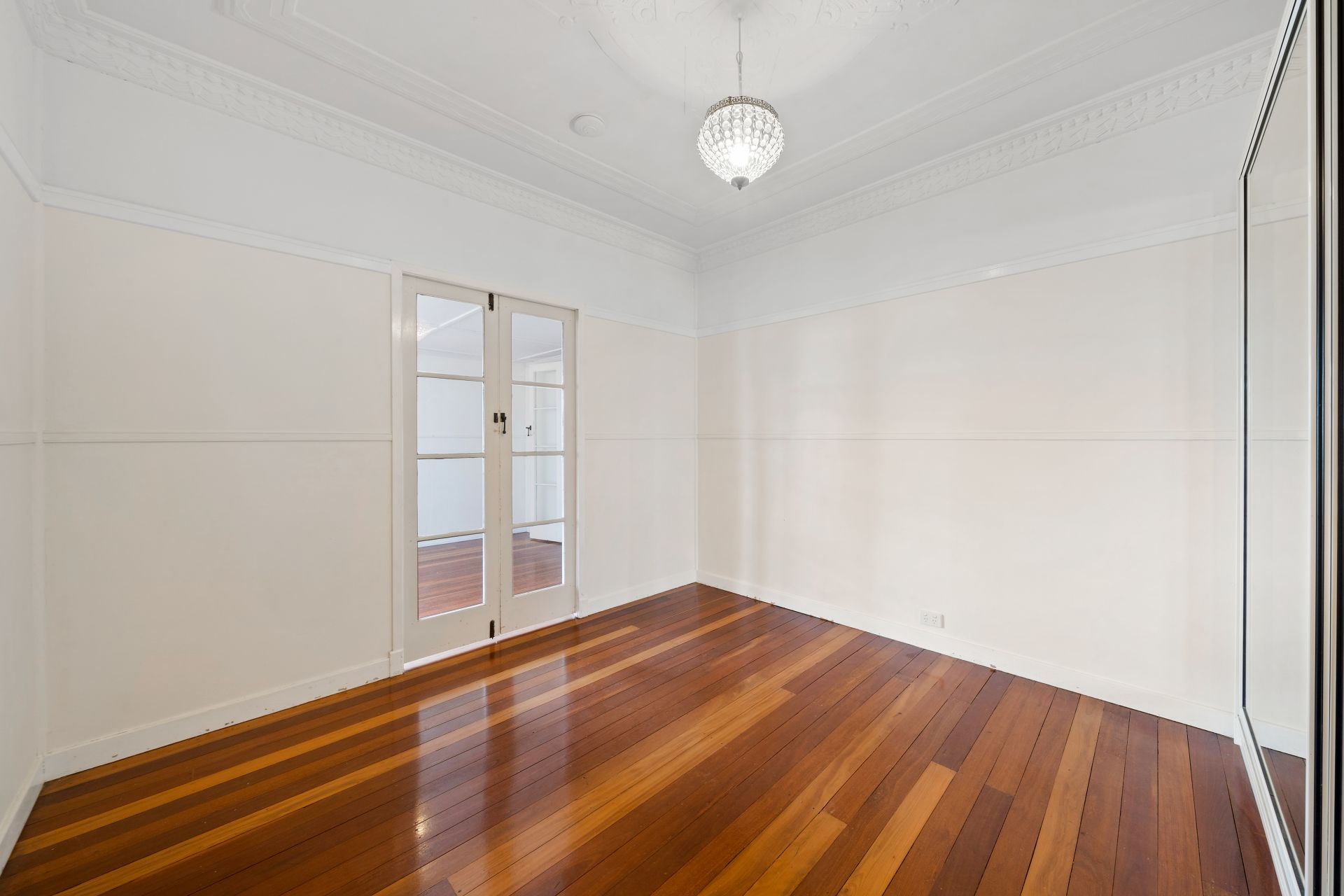 > Bedroom 2 offers extra-high ceilings, a mirrored built-in robe, polished timber floors, dado and picture railing, ornate ceiling and cornicing, pendant lighting, and French doors opening to the sunroom.