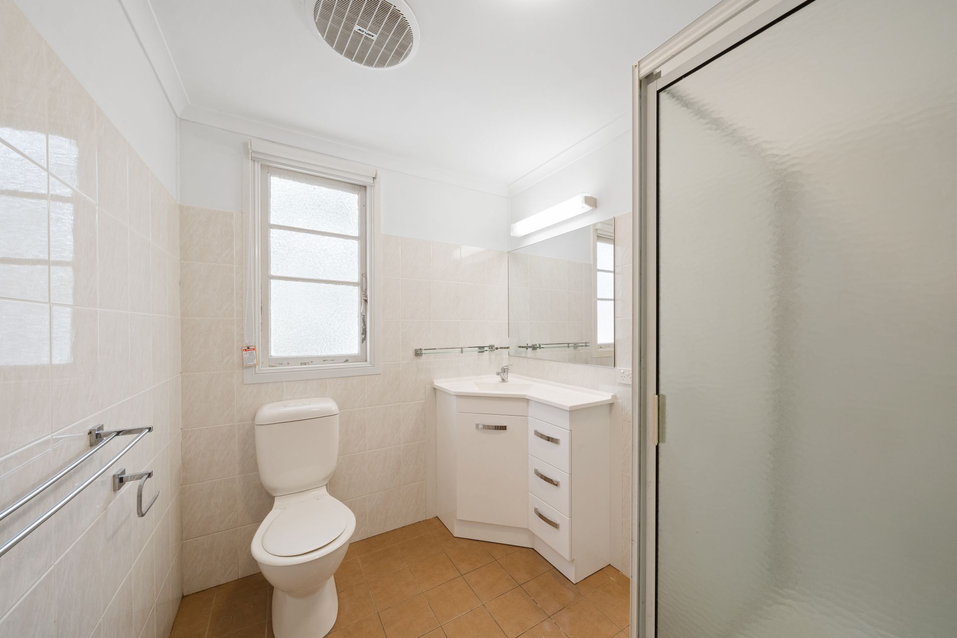 > The main bathroom features a shower over bath configuration with fixed shower head, single basin vanity with underneath storage, oyster and wall lighting, extractor fan, tile flooring and splashback, casement window, roller blinds, towel rails, hand towel hooks and toilet.