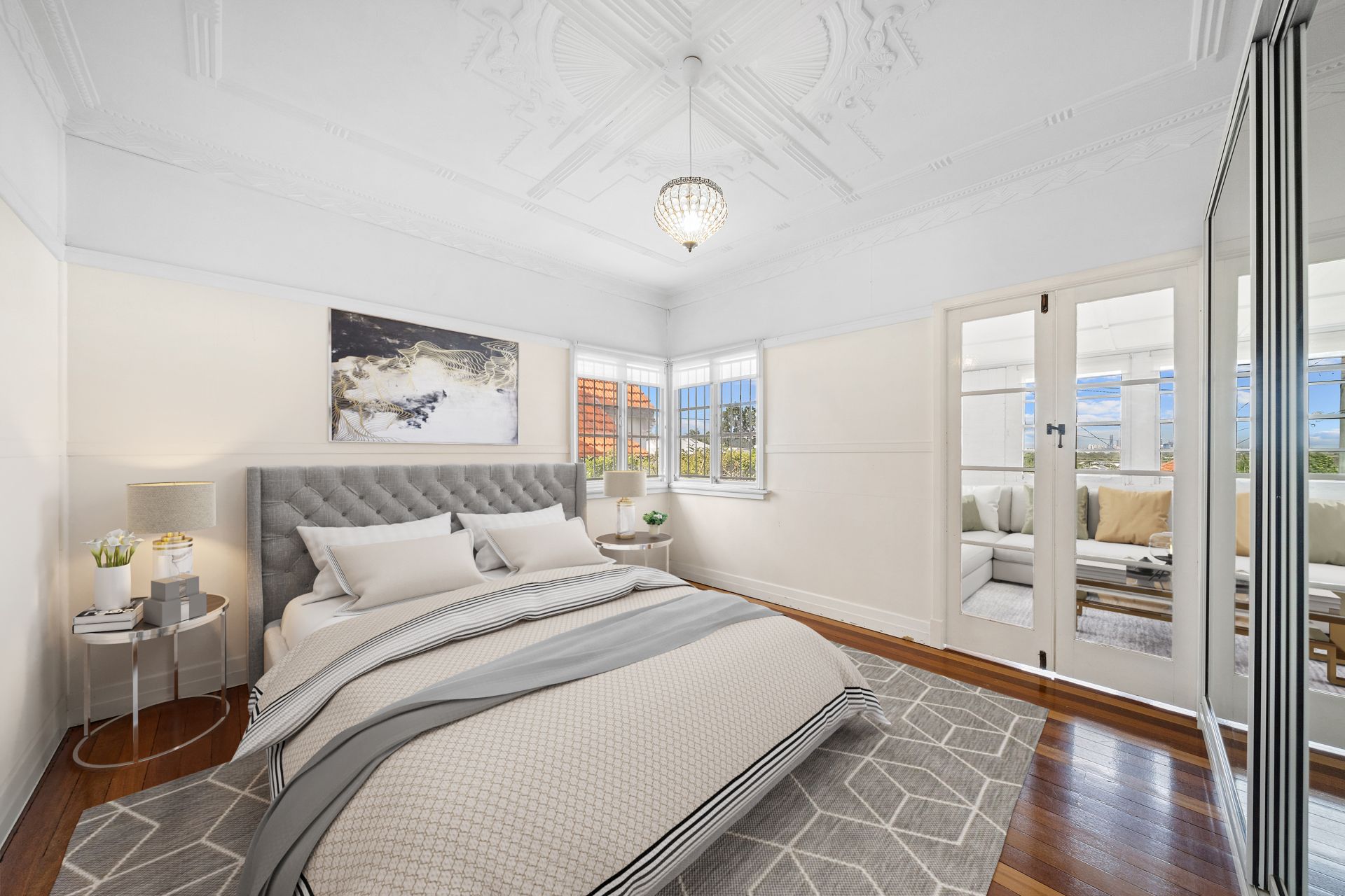 > The master bedroom offers extra-high ceilings, mirrored built-in robe, polished timber floors, dado and picture railing, ornate ceiling and cornicing, pendant lighting, casement windows, fly screens, security bars, roller blinds, and French doors opening to the sunroom.