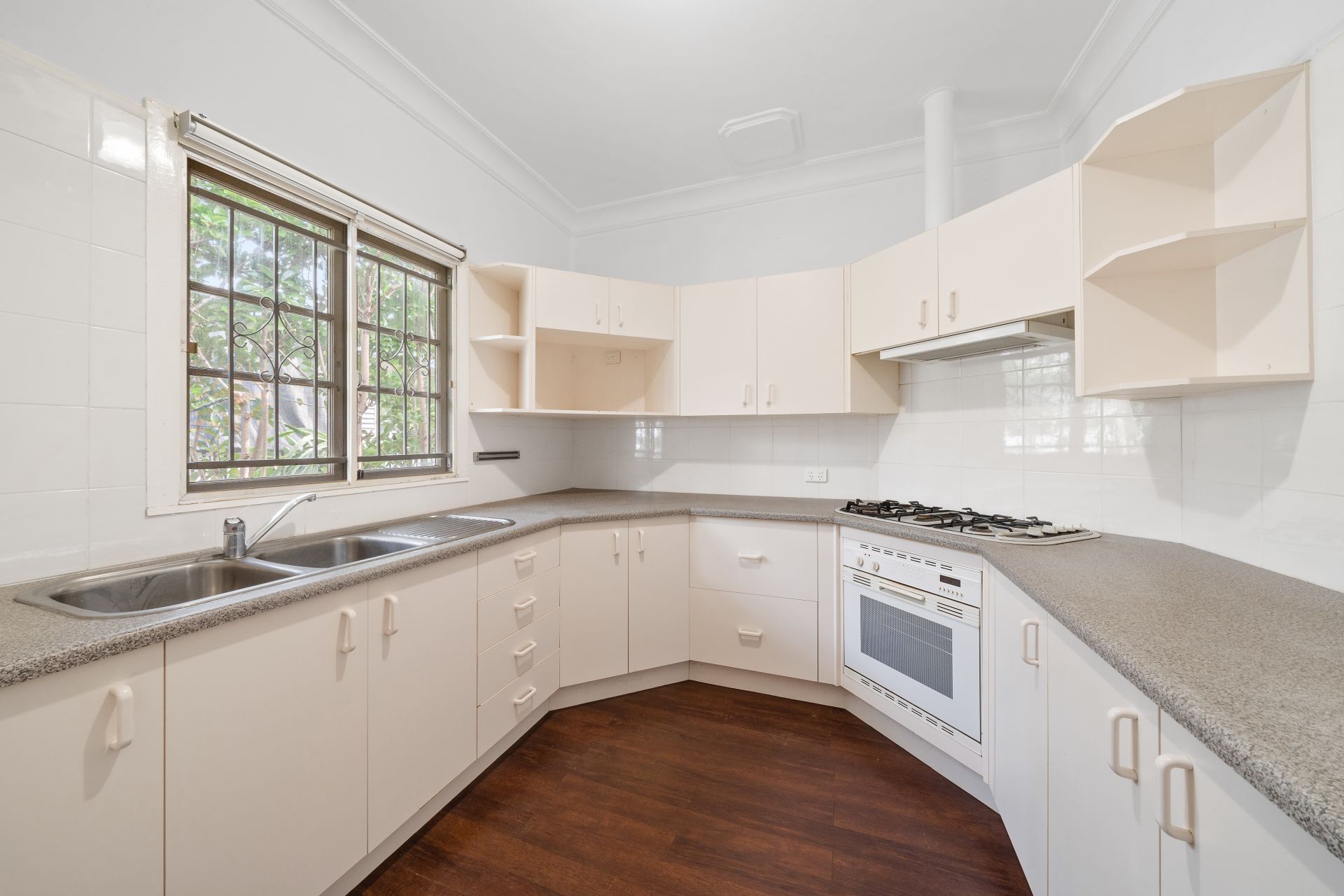 - The kitchen is neatly tucked away at the back of the home and features, a five-burner gas cooktop, oven, retractable rangehood, plenty of cupboards, a double stainless-steel sink, casement windows, fly screens, security bars, roller blinds and ornate ceiling work.