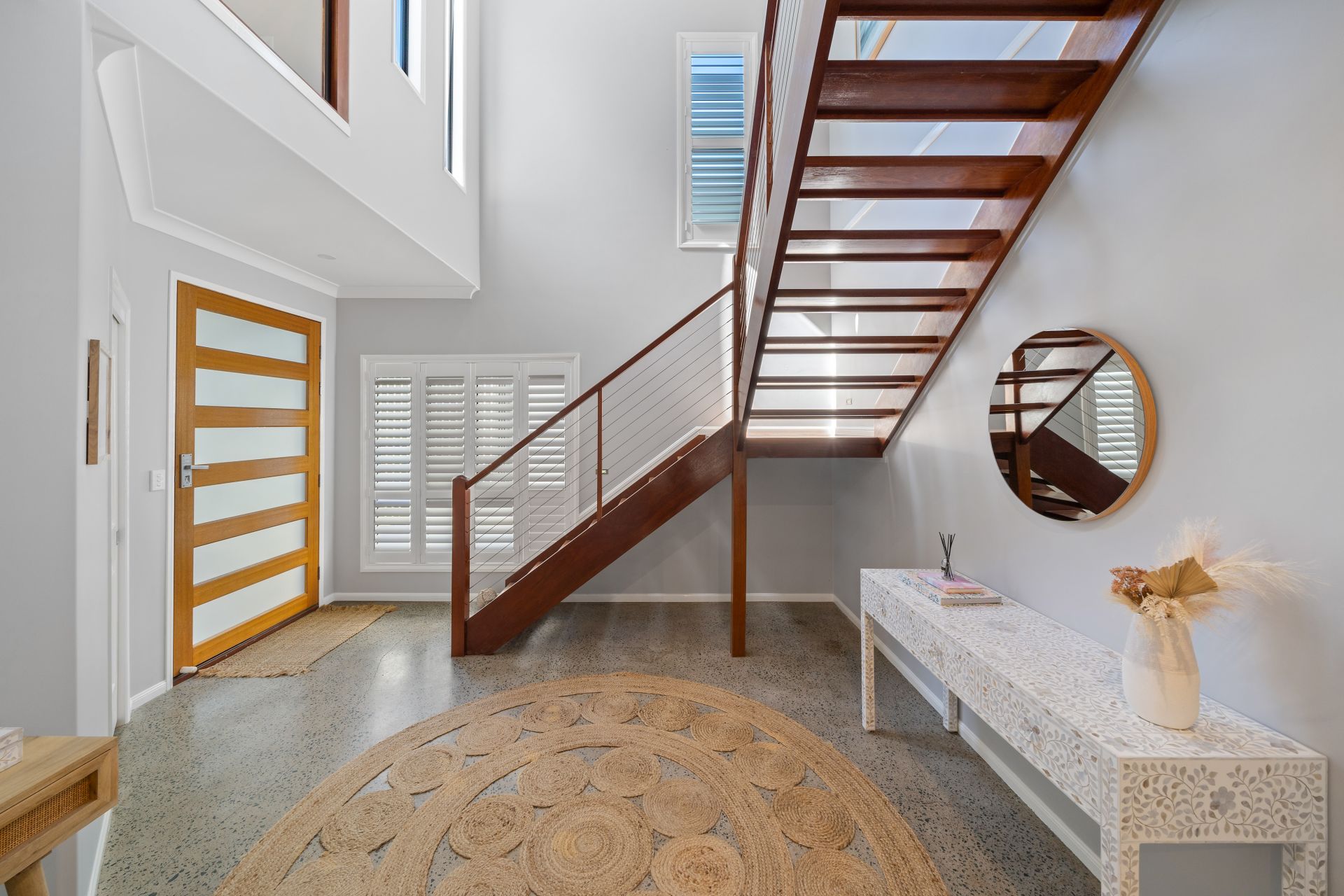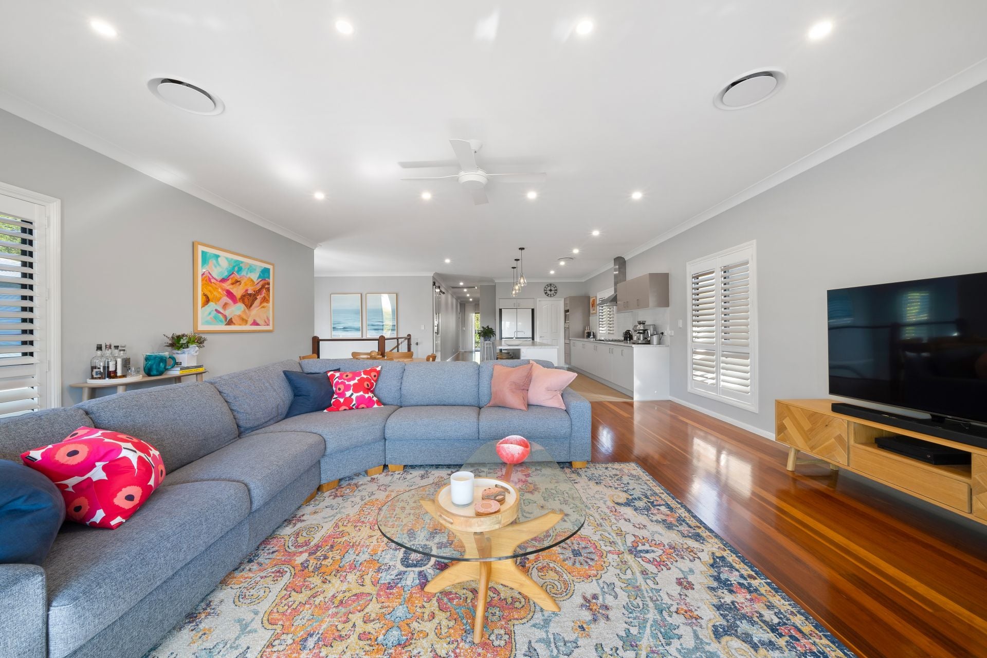 > The open plan main living/dining area located on the top-level at the front of the home offers the perfect space to relax and unwind. The light and contemporary colour scheme and the extra-high ceilings add to the expansive nature of the home, boasting Fujitsu ducted air conditioning, ceiling fan, down-lighting, polished timber flooring, sliding windows with Crimsafe security screens, plantation shutters, and glass sliding doors giving you access to the front deck area.