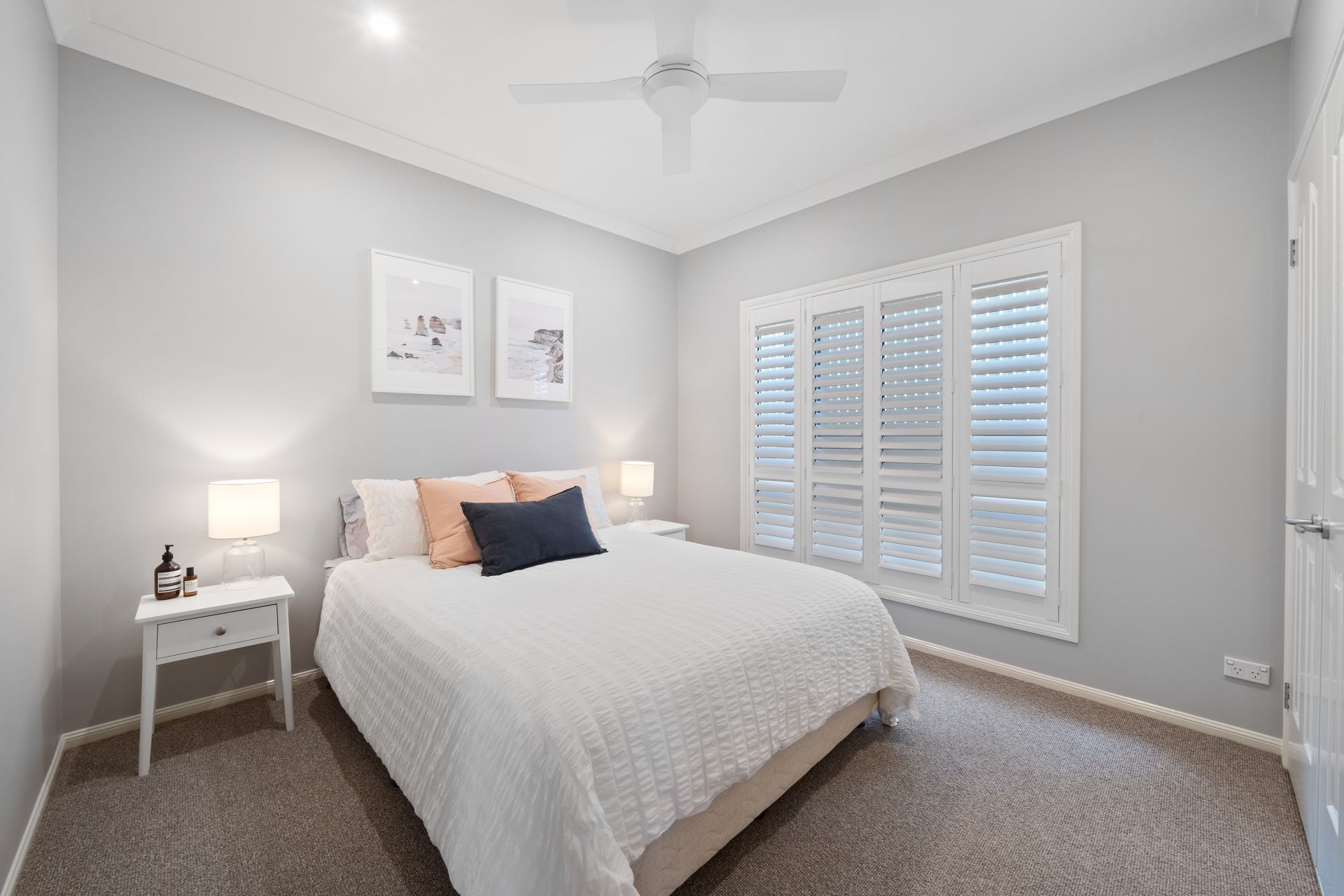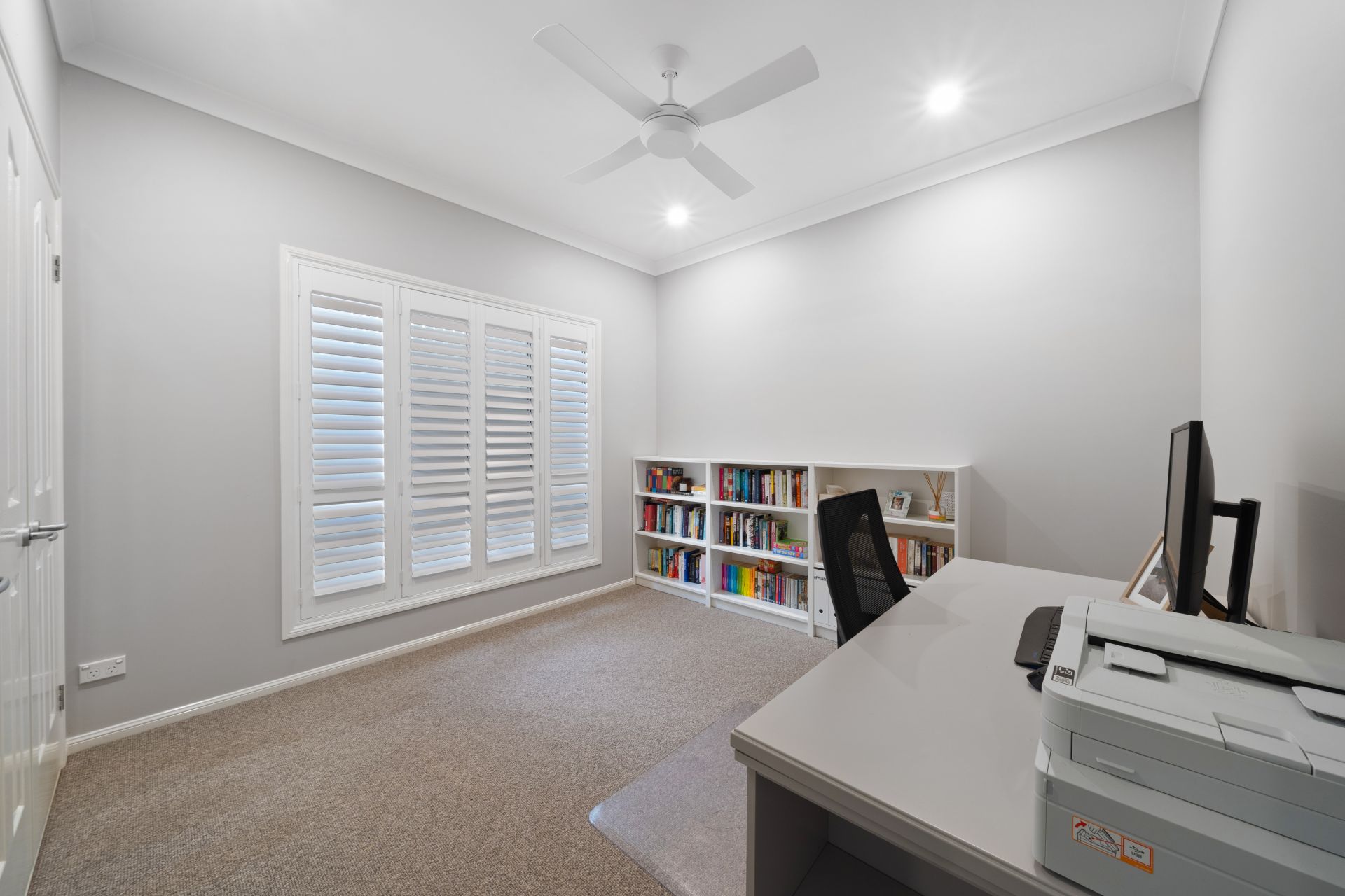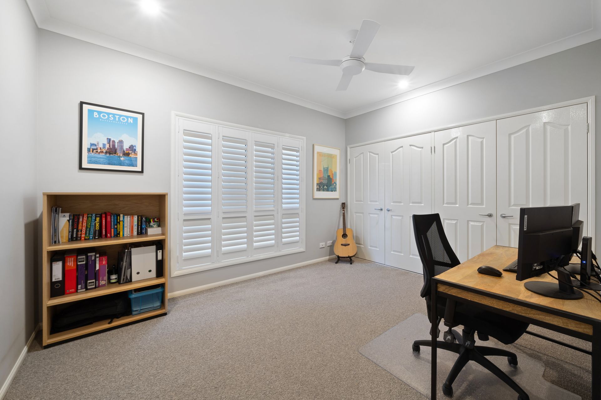 > Bedrooms 3, 4 and 5 located on the lower-level, two currently being used as home offices, offer extra-high ceilings, ceiling fans, down-lighting, carpet flooring, large built-in robes, sliding windows with Crimsafe security screens, and plantation shutters.