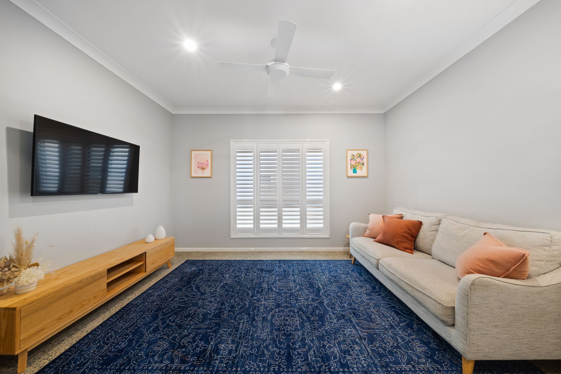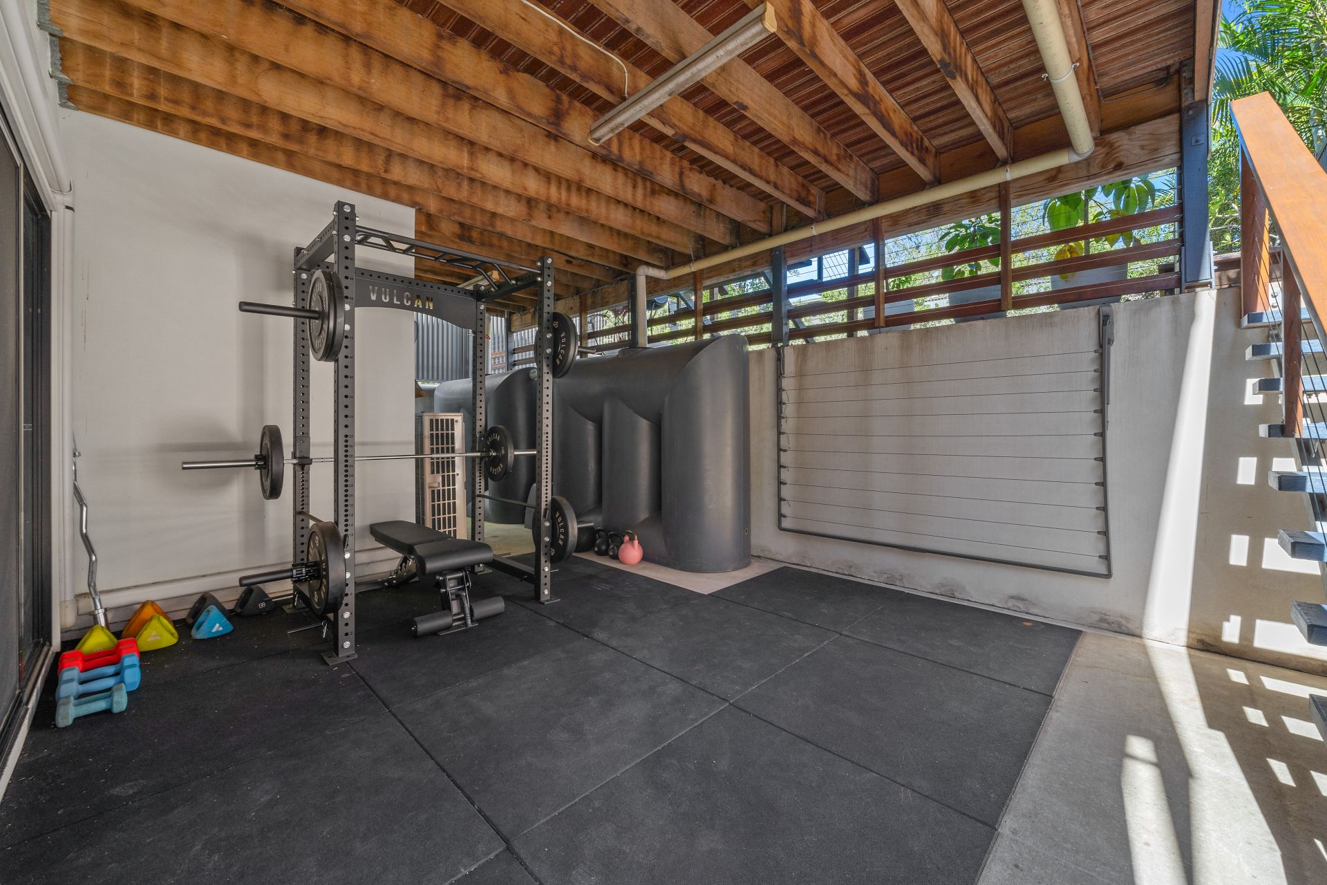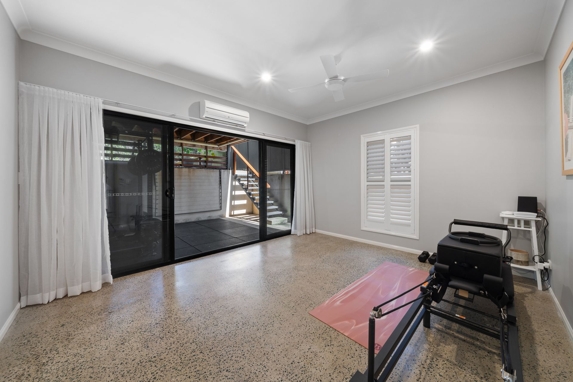 > Located on the lower-level at the rear of the home is an additional living space offering extra-high ceiling, polished concrete flooring, Fujistu split-system air conditioning, down-lighting, ceiling fan, sash window with Crimsafe security screen, plantation shutters and glass sliding doors with a combination of floor-to-ceiling sheer and block out curtains opening out to the rear covered patio.