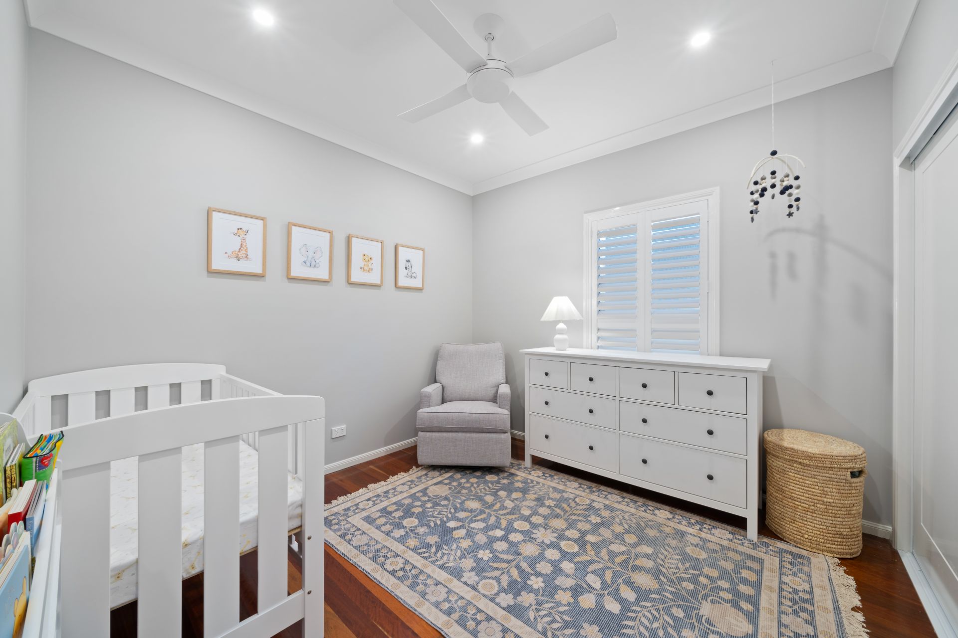 > Bedroom 2 located on the top-level offers extra-high ceilings, Fujitsu ducted air conditioning, ceiling fan, down lighting, polished timber flooring, built-in robe, sash window with Crimsafe security screens, and plantation shutters.
