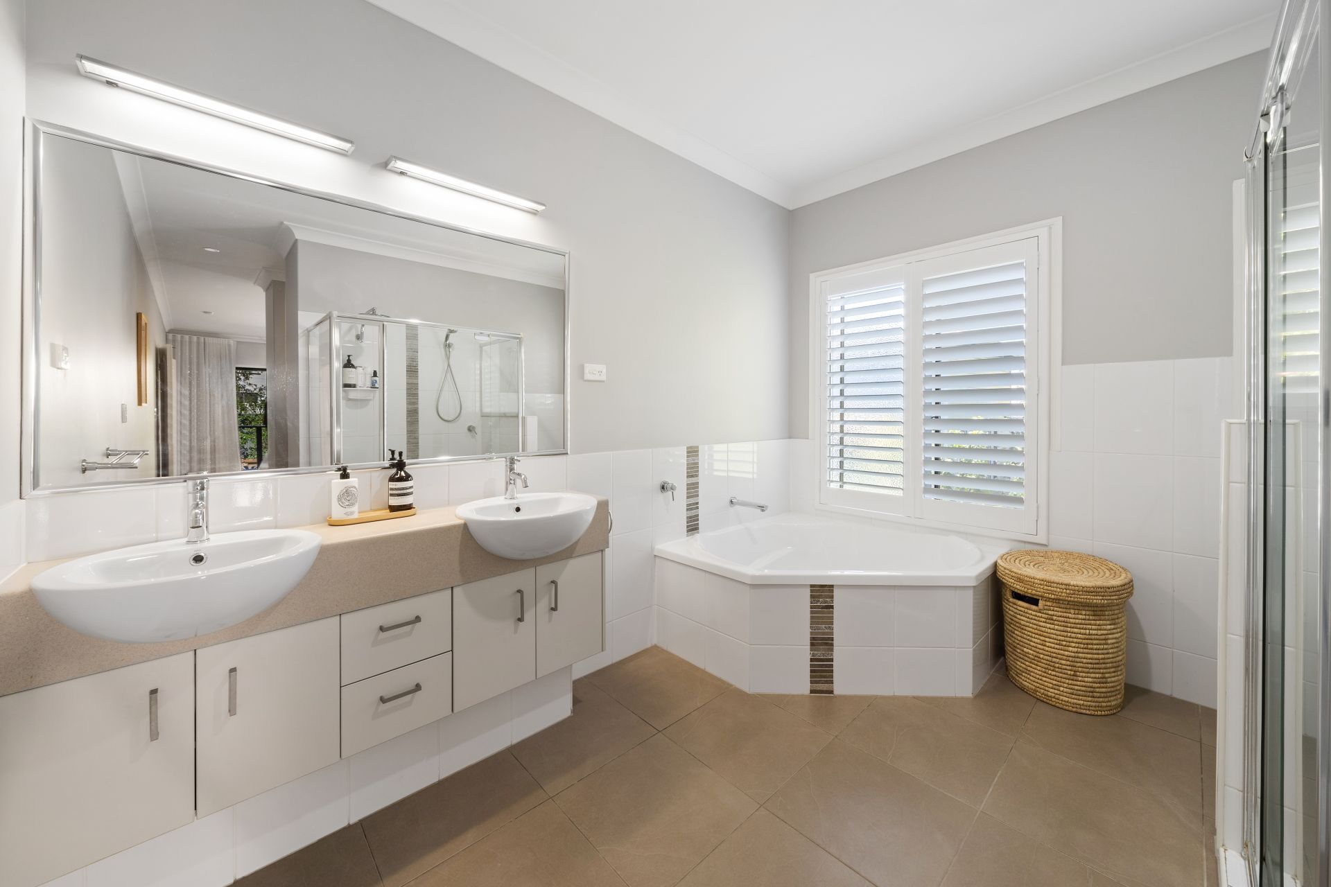 > The ensuite to the master features a shower with rain drop and detachable showerheads, separate corner bath, toilet, Fujitsu ducted air conditioning, double basin vanity with underneath storage, tile splashback and flooring, large, framed vanity mirror, extractor/heater/light combo, wall sconce lighting, towel rails, hand towel ring, sliding windows with privacy glass and Crimsafe, plantation shutters.
