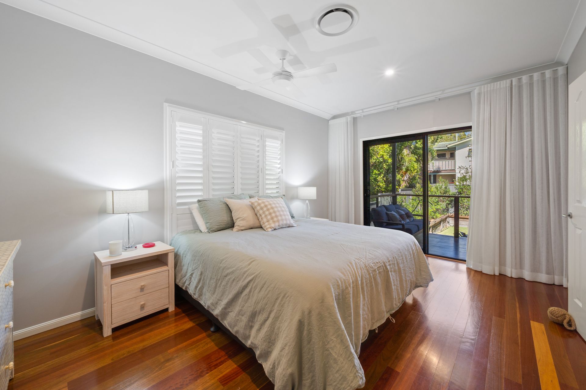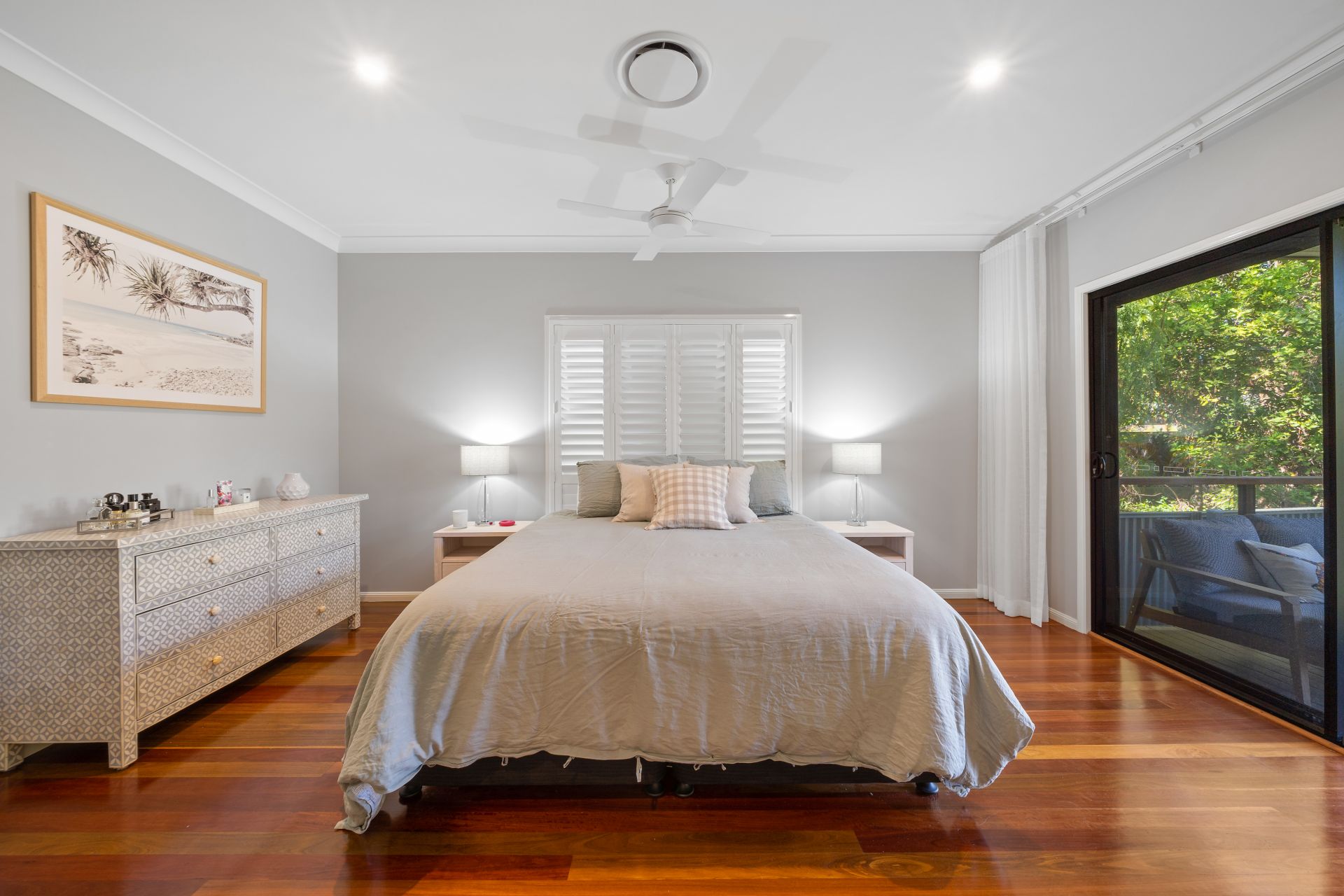 > The master located on the top-level is perfect for those who enjoy their own space boasting extra-high ceilings, Fujitsu ducted air conditioning, ceiling fan, down lighting, polished timber flooring, walk-in robe, sliding glass windows with Crimsafe security screens, plantation shutters, sliding glass door opening to the rear entertaining deck with a combination of floor-to-ceiling sheer and block out curtains, and a spacious ensuite.