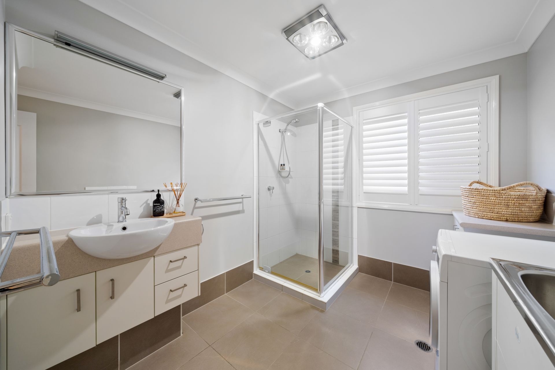 > The main European bathroom located on the lower level features a shower with a detachable showerhead, single basin vanity with underneath storage, framed vanity mirror, tiled splashback and flooring, extractor/heater/light combo, wall sconce lighting, towel rails, hand towel ring, sliding window with privacy glass and Crimsafe security screen, plantation shutters, stainless steel washtub, and laminate bench with underneath storage.