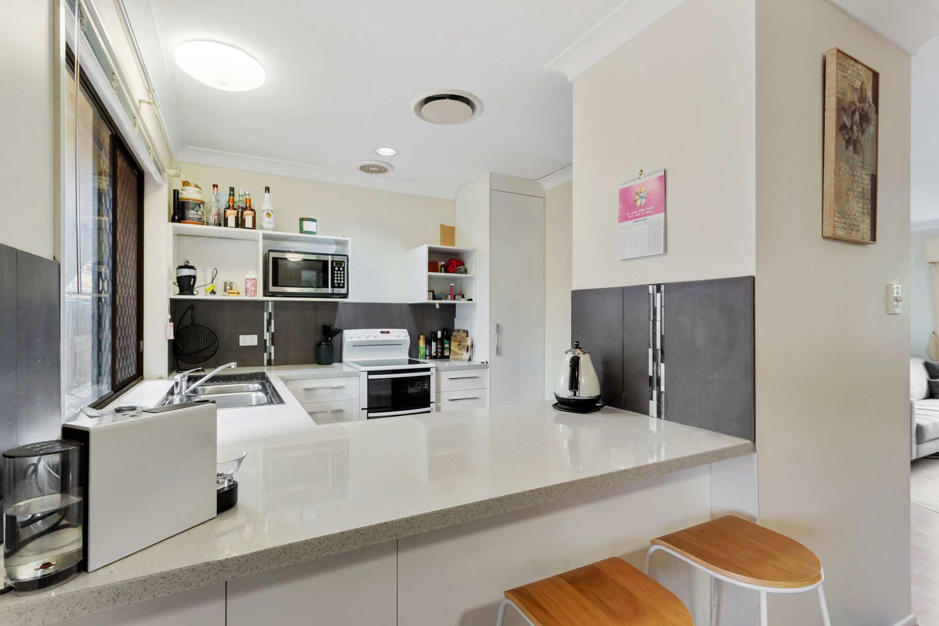 - Kitchen is the hub of the home and this little house has a well-designed kitchen. The modern kitchen features an electric free-standing oven and grill, stainless steel dishwasher, shelving and microwave space, ample laminate benches with a breakfast bar, pot drawers and pantry. Security screen, exhaust fan and roll down privacy blind.