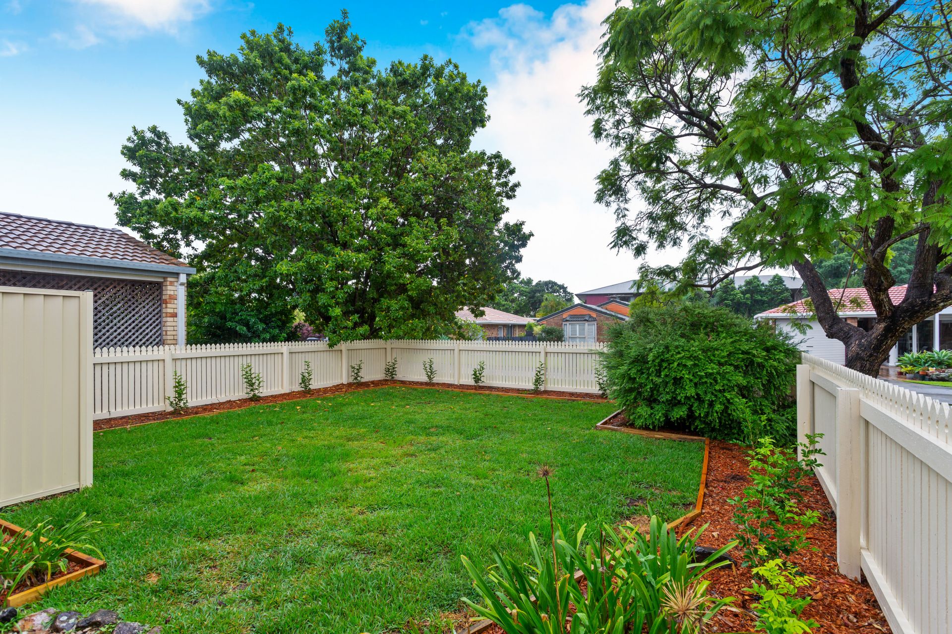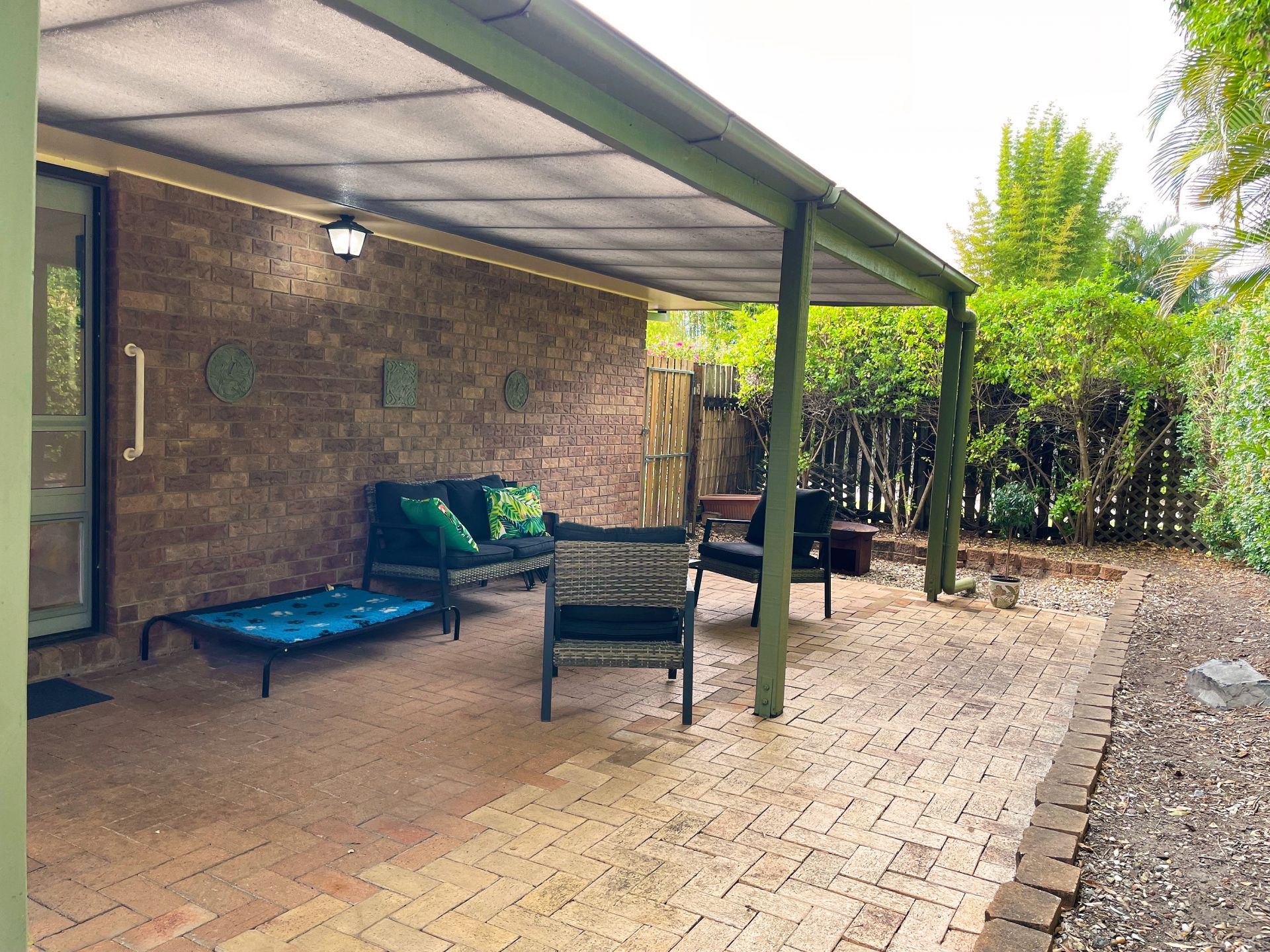 > The covered private outdoor entertaining area is fully fence. Paved flooring and mature trees provide a relaxing quiet oasis.