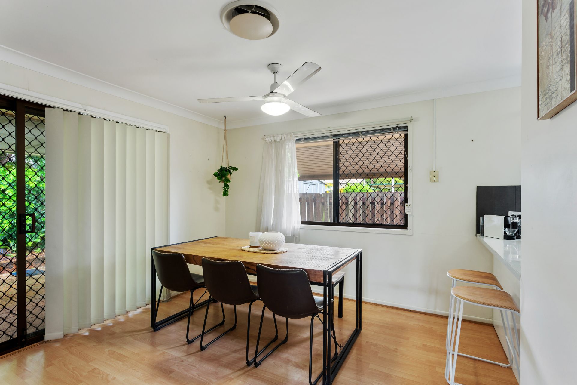 > The dining room is large enough to hold a 6-seater table it's flexible design can accommodate a study nook or work-from-home space. The neutral colour tone, timber-look flooring, security screens on window and sliding glass door, roll down privacy blind, combination ceiling fan and light, ducted air-conditioning.