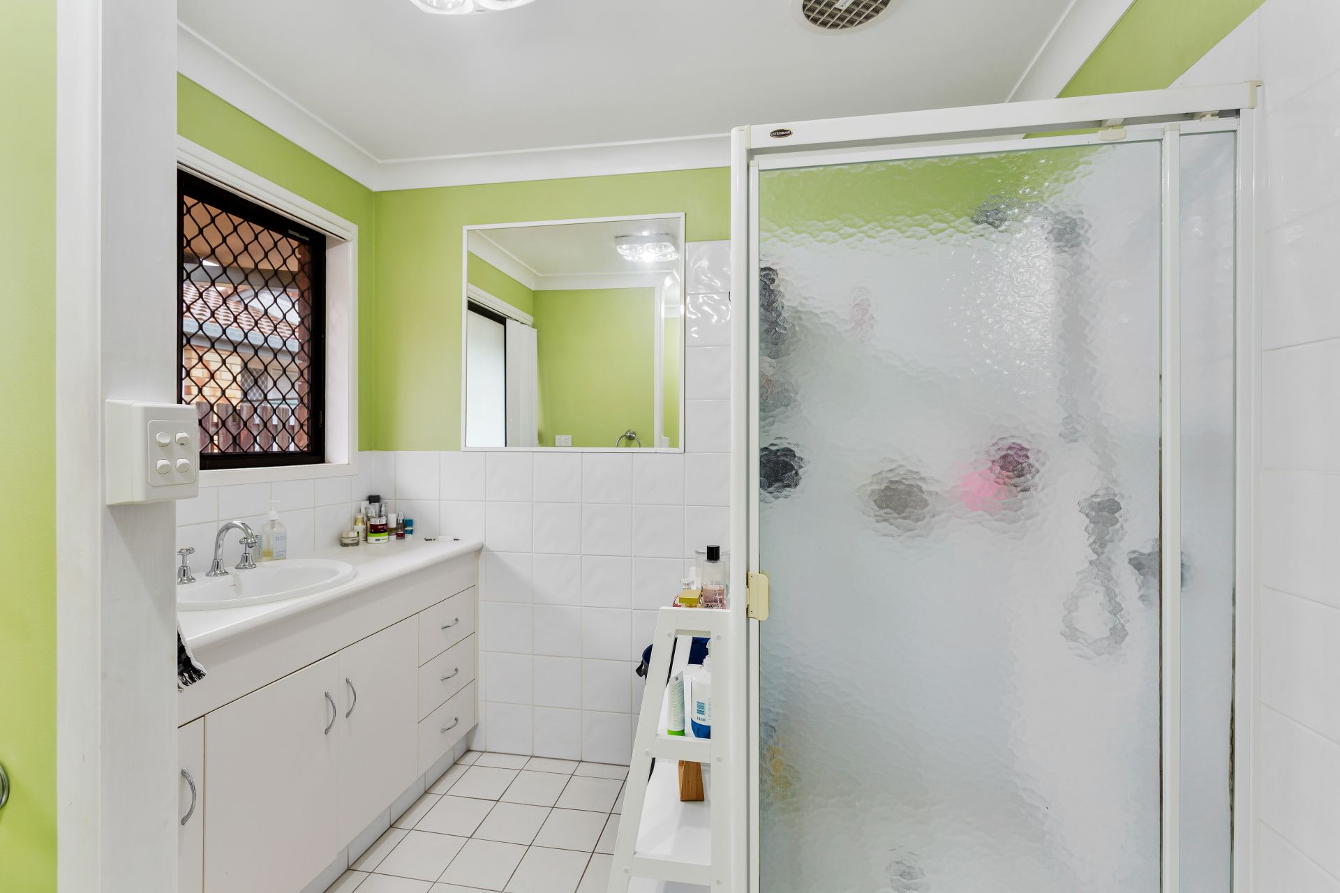 - Bathroom is filled with light and is very well designed. Shower cubical, combination heat and exhaust fan, large square mirror, large vanity with three drawers and three cupboards, single basin, hand towel holder and toilet