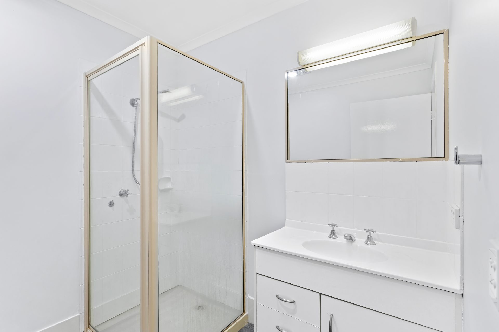 - The main bathroom conveniently located in the bedroom wing of the home offers a shower with a detachable shower head, single basin vanity with storage cupboards and drawers, large, framed mirror, sky light, fluorescent lighting, and an exhaust fan.