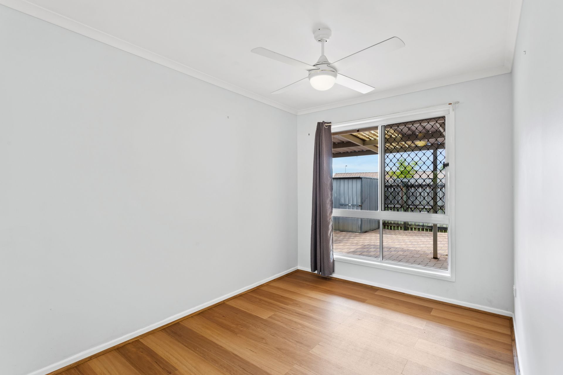> Bedroom 2 offers a ceiling fan with in-built lighting, timber-look flooring, mirrored built-in robe, and a sliding window with security grilles, fly screens and curtains overlooking the outdoor entertaining area.