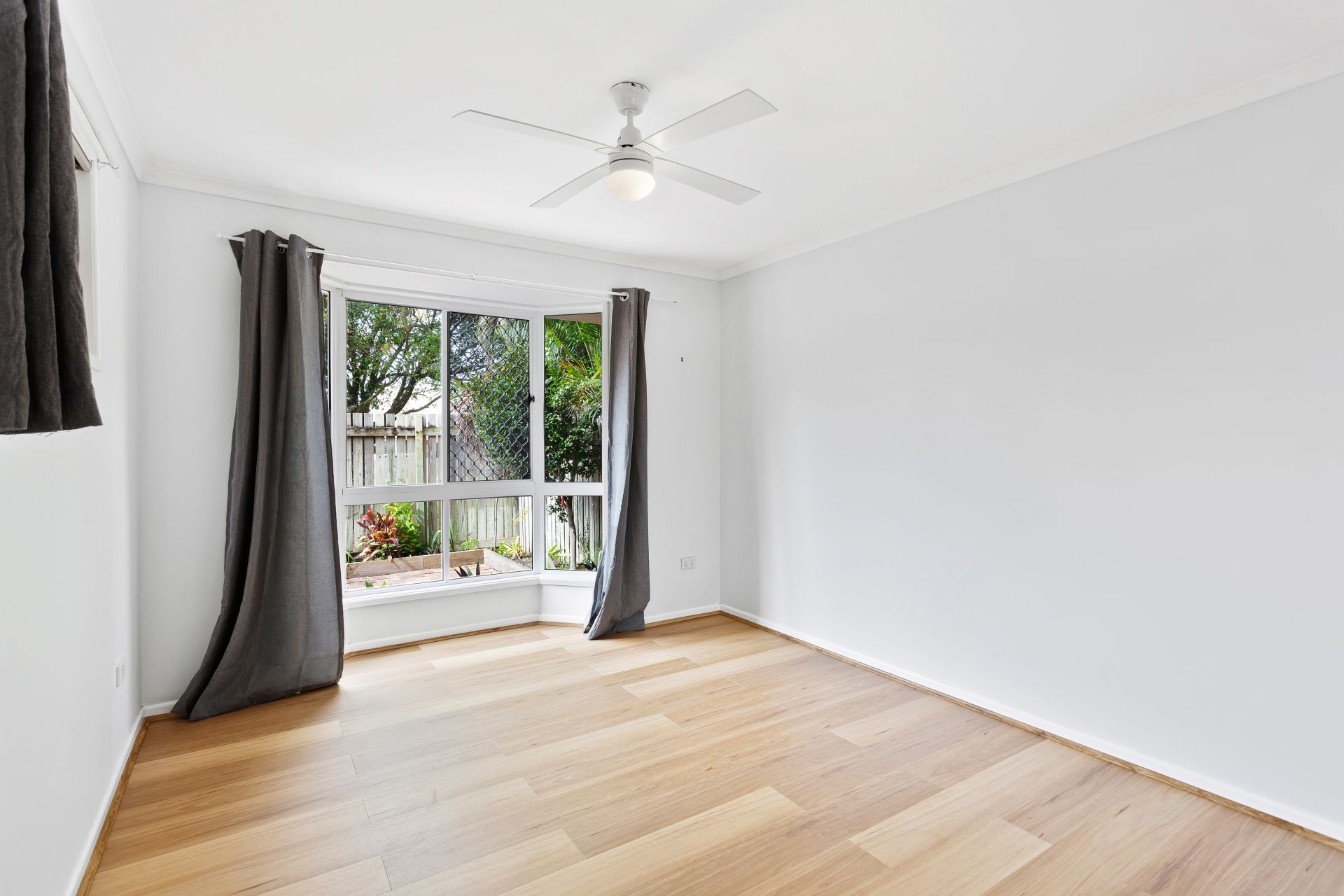 > The master bedroom offers a ceiling fan with in-built lighting, timber-look flooring, mirrored built-in robe, and a bay window with security grilles, fly screens and curtains overlooking the entertaining area.