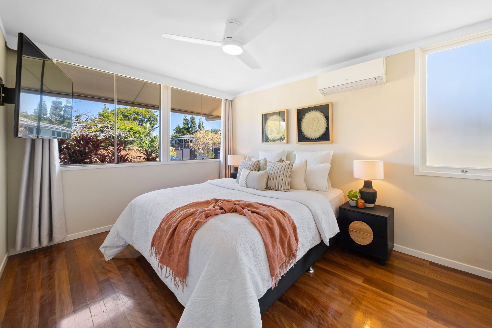 >The master bedroom features polished timber flooring, remote controlled ceiling fan with light, Fujitzu split-system air-conditioner, built-in wardrobes, built in desk, wall mounted Samsung 55inch TV, casement window and sliding windows with curtains.