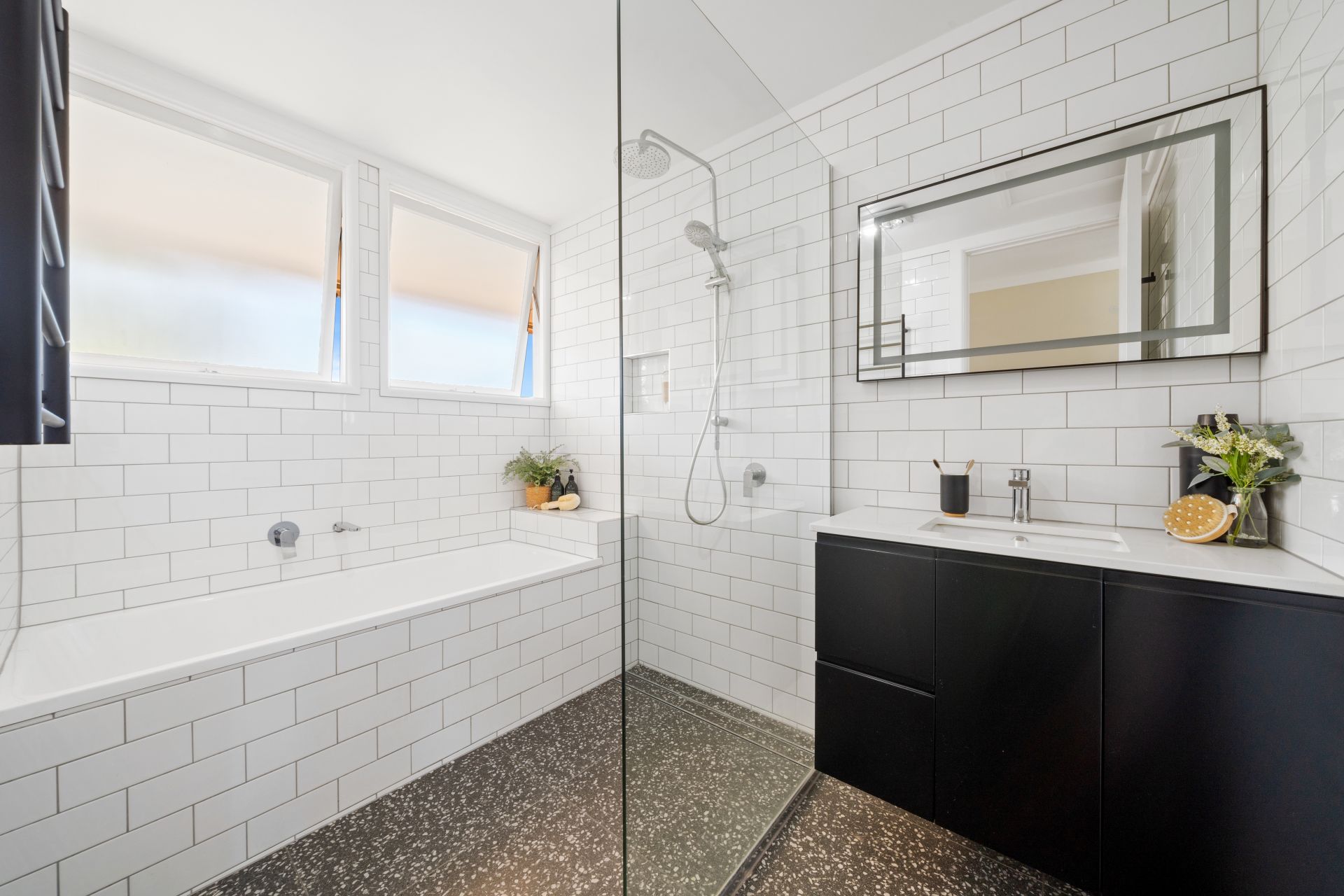 >The bathroom boasts a walk-in shower with wall niche, monsoon and detachable shower head, separate bath, floor to ceiling tiles, floating cabinet with stone bench top and under mount sink, frosted windows and towel ladder.