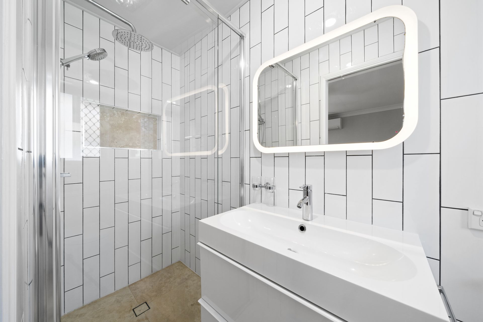 > The ensuite bathroom to the master features floor-to-ceiling tiles, shower with a detachable and raindrop showerhead, single floating basin vanity with storage, back-lit vanity mirror, lighting/extractor/heat combo, towel rack and hand towel rail, sliding frosted window with fly screen and security grille and toilet.