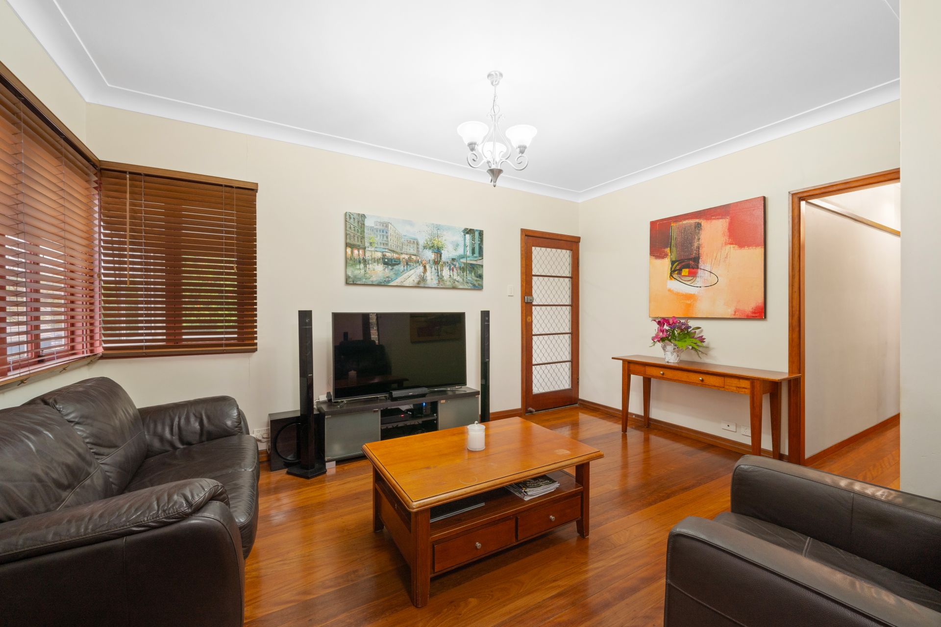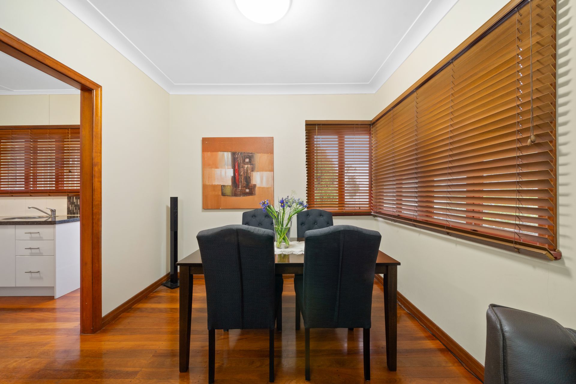 > The lounge and dining rooms flow effortlessly from the sunroom and front porch. Featuring extra-high ceilings, ornate cornicing, rich timber flooring, pendant as well as oyster lighting, casement windows with venetian blinds and rear access to the yard