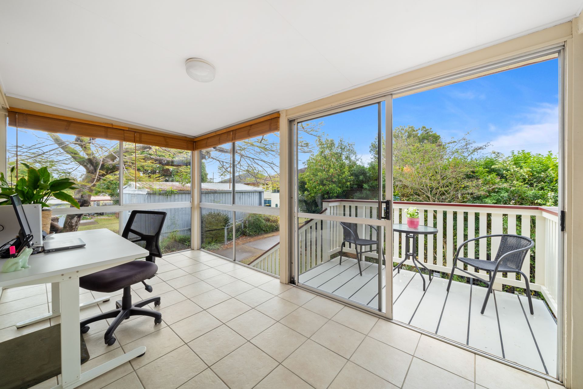 > The sunroom located at the front of the property is the perfect place for home office or kids playroom featuring tiled flooring, sliding windows and oyster lighting.