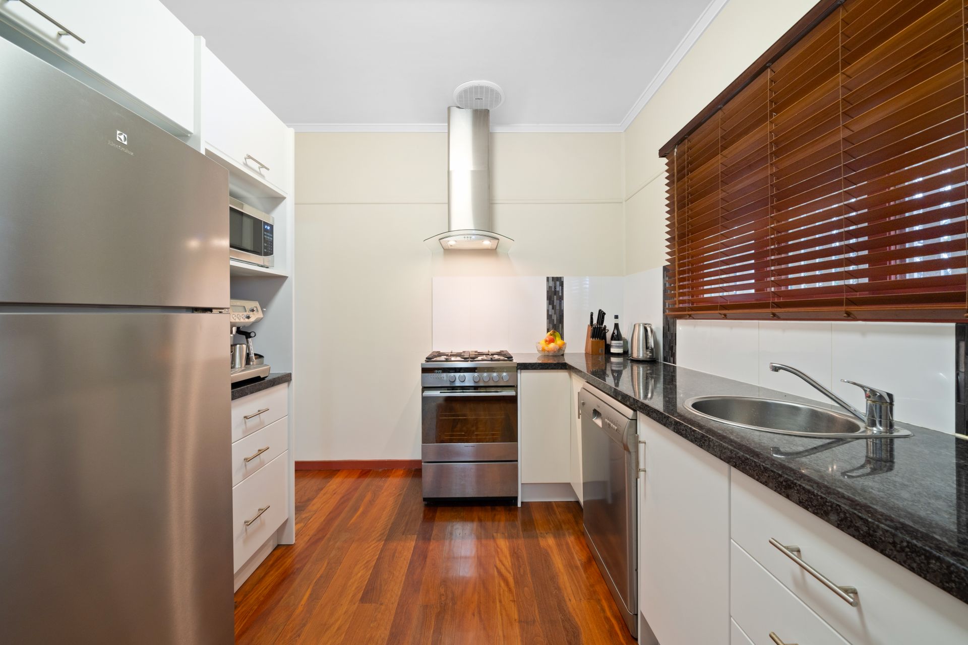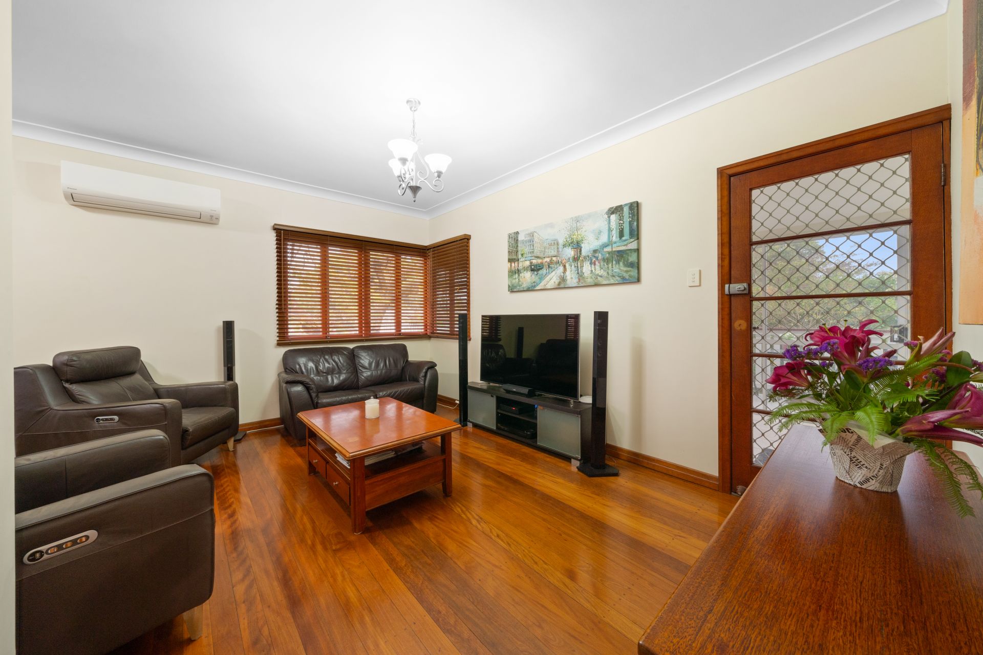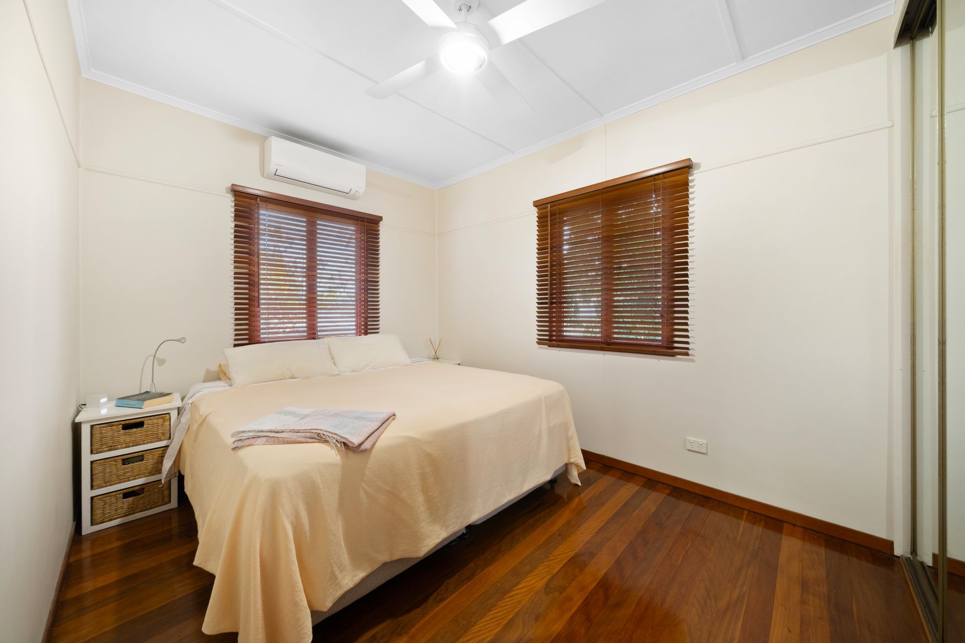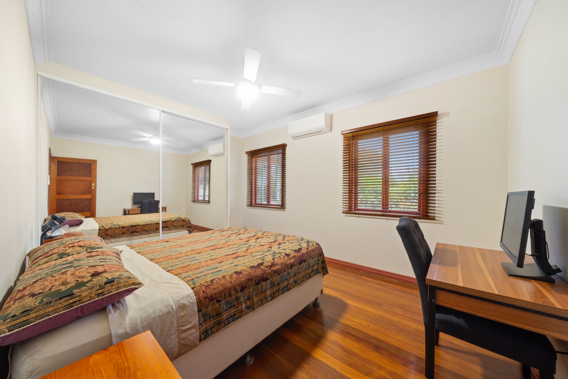 > Bedroom 3 features extra-high ceilings, Dakin split-system air-conditioning, rich timber flooring, ceiling fan with lighting and casement windows with venetian blinds.