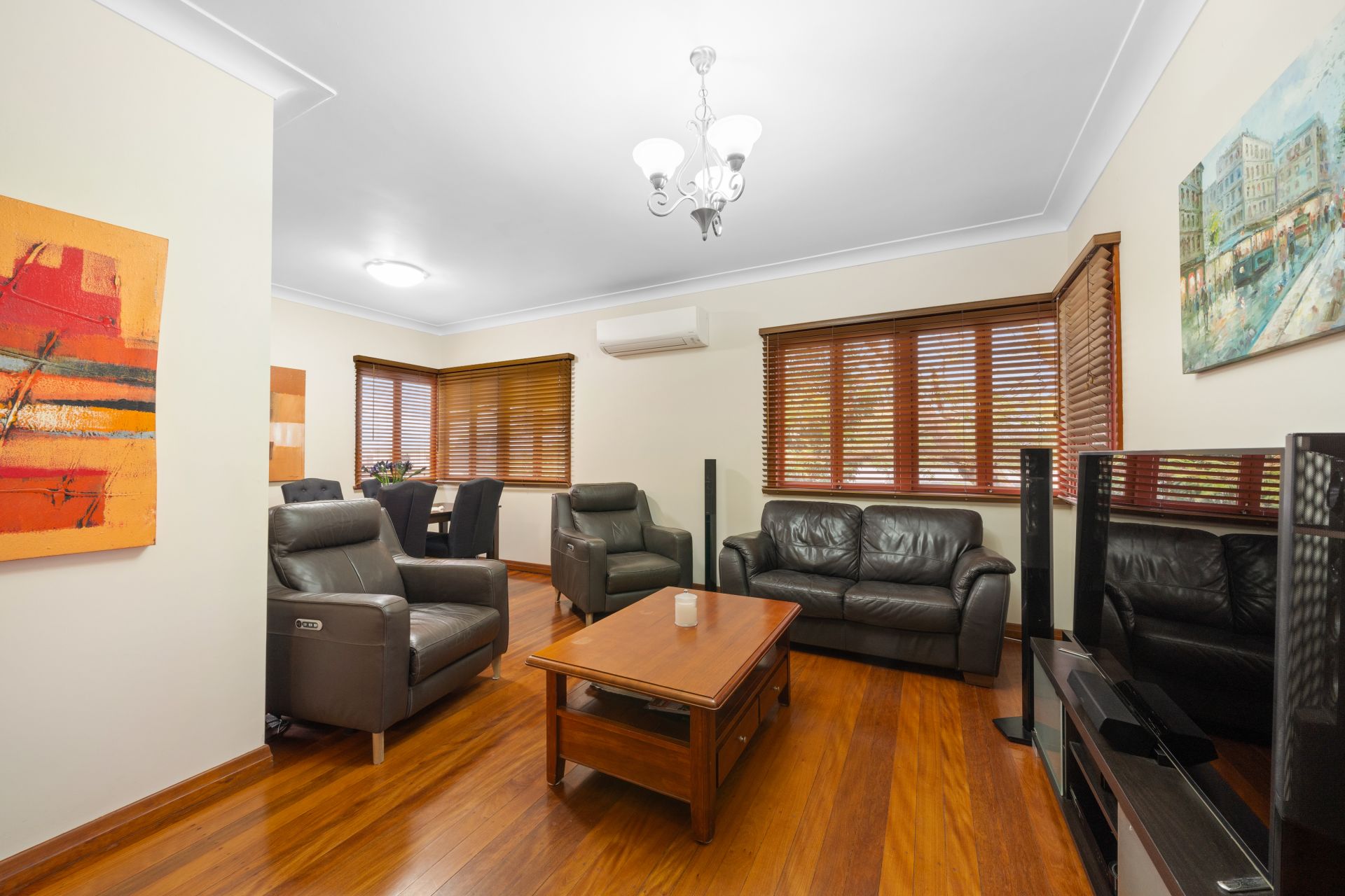 > The palatial master is a light-filled space offering extra-high ceilings with ornate cornicing, Dakin split-system air-conditioning, rich timber flooring, ceiling fan with lighting, casement windows with venetian blinds and built-in robe.