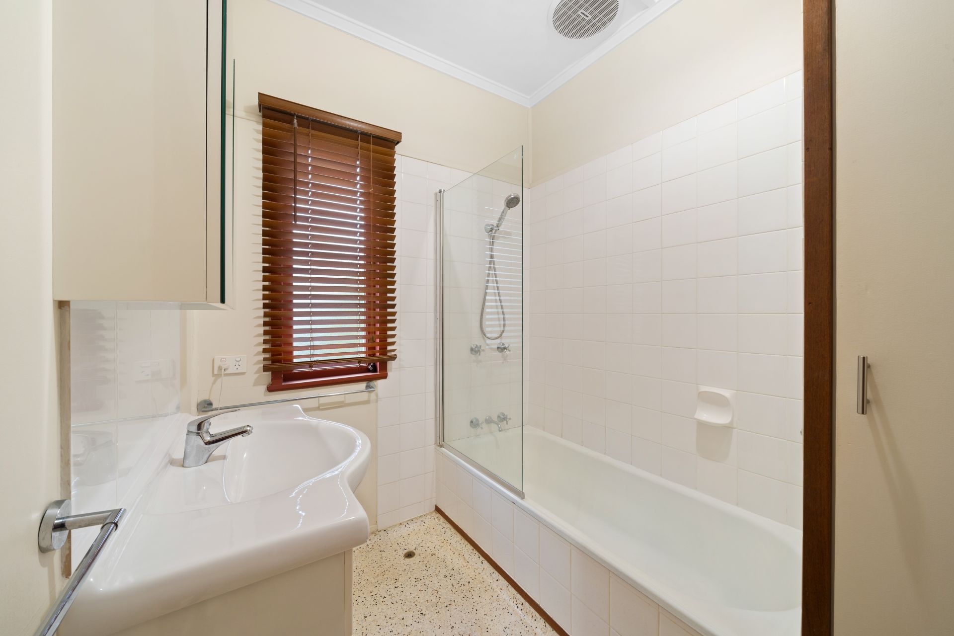 > The well-appointed main bathroom located in the heart of the home features an extra-high ceiling, shower over bath configuration, single basin vanity with storage, wall mounted vanity mirror cabinets, towel rail, terrazzo flooring, casement windows with venetian blinds and separate toilet.