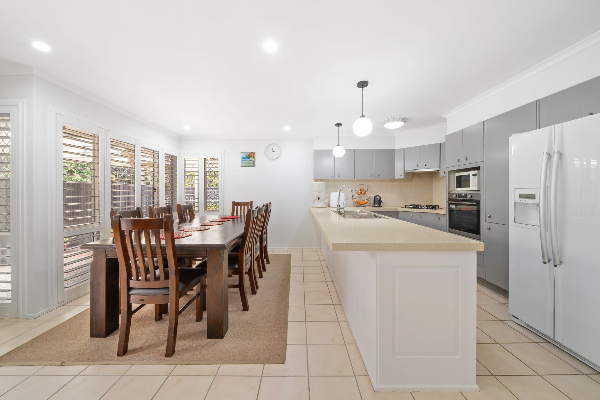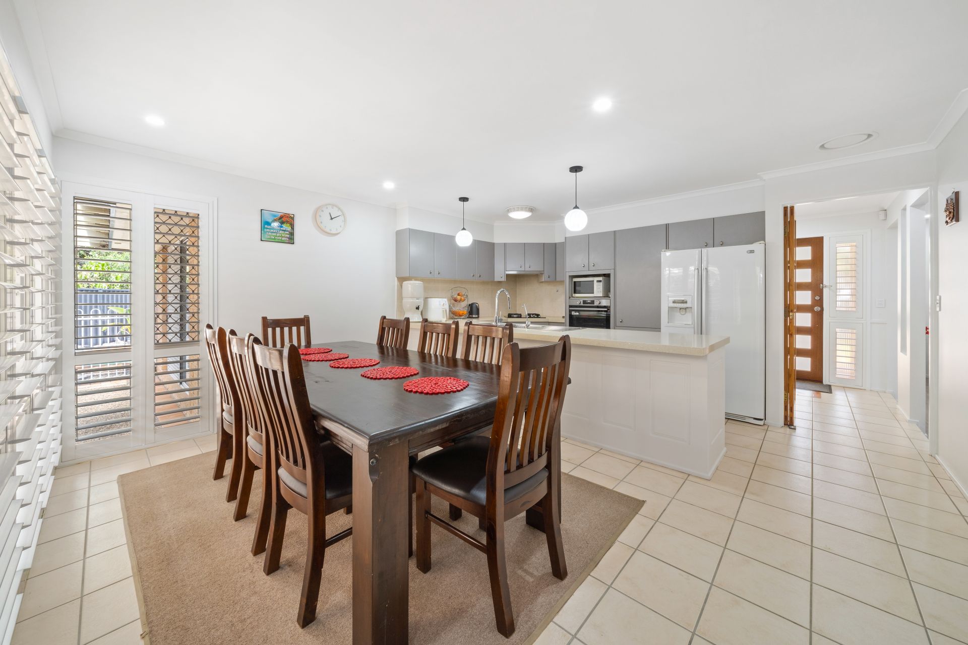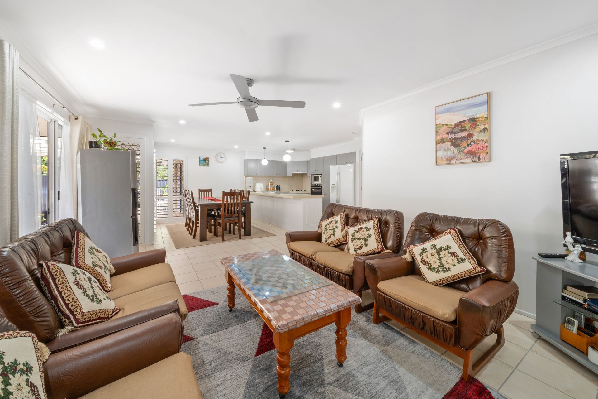 > The light-filled Living/ dining located at the rear of the home features split system air-conditioning, sliding windows with security screens, plantation shutters, tiled flooring, ceiling fan, down-lighting and large glass sliding doors giving you access to the rear entertaining area.