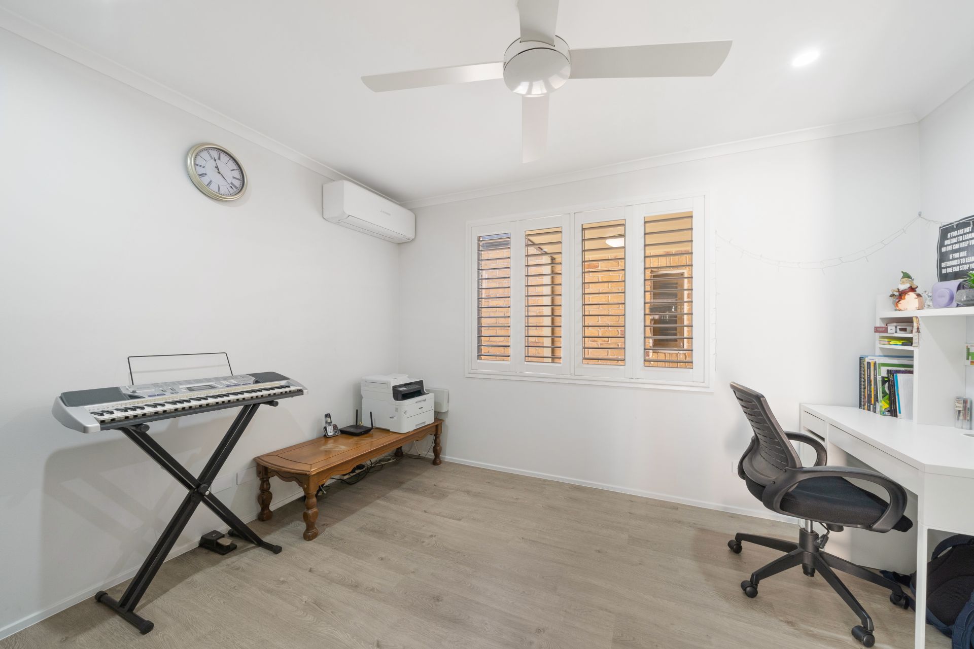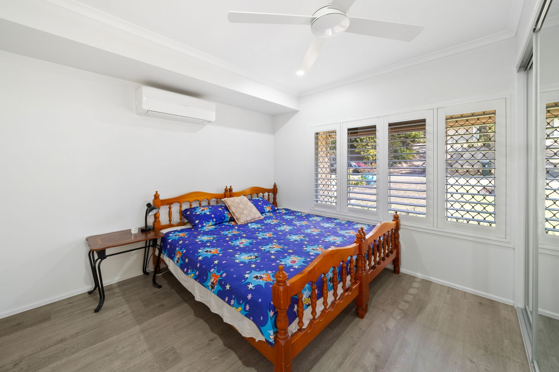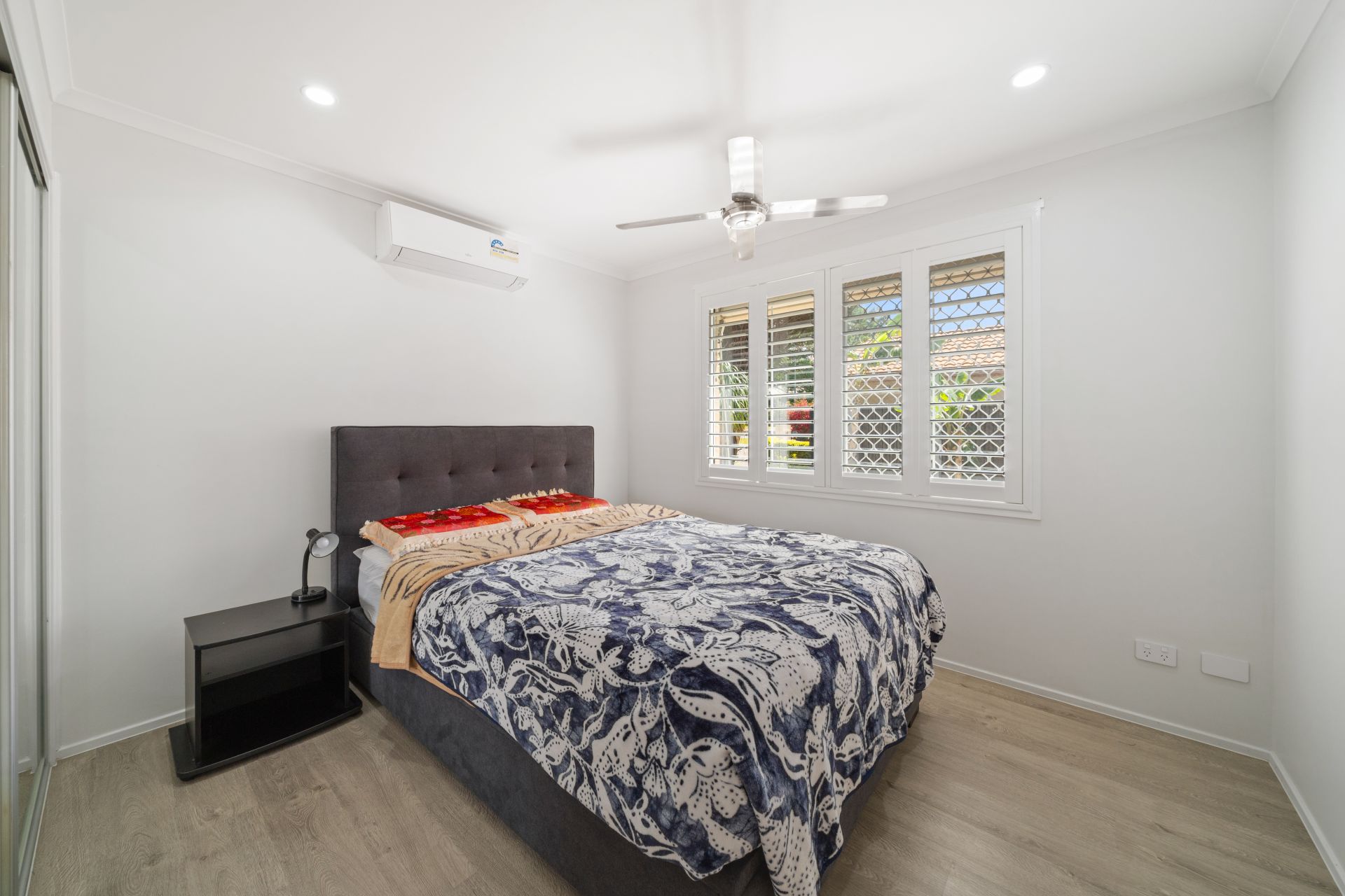 > Bedroom 4 boasts split system air-conditioning, timber look flooring, down-lighting, ceiling fan, built-in robe, sliding window and plantation shutters.