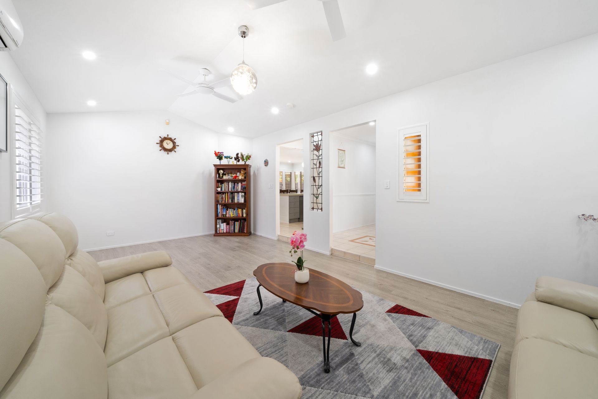 > The lounge room located at the front of the home features high ceilings, timber look flooring, split-system air-conditioning, pendant as well as down-lighting, ceiling fans with sliding windows with security screens.