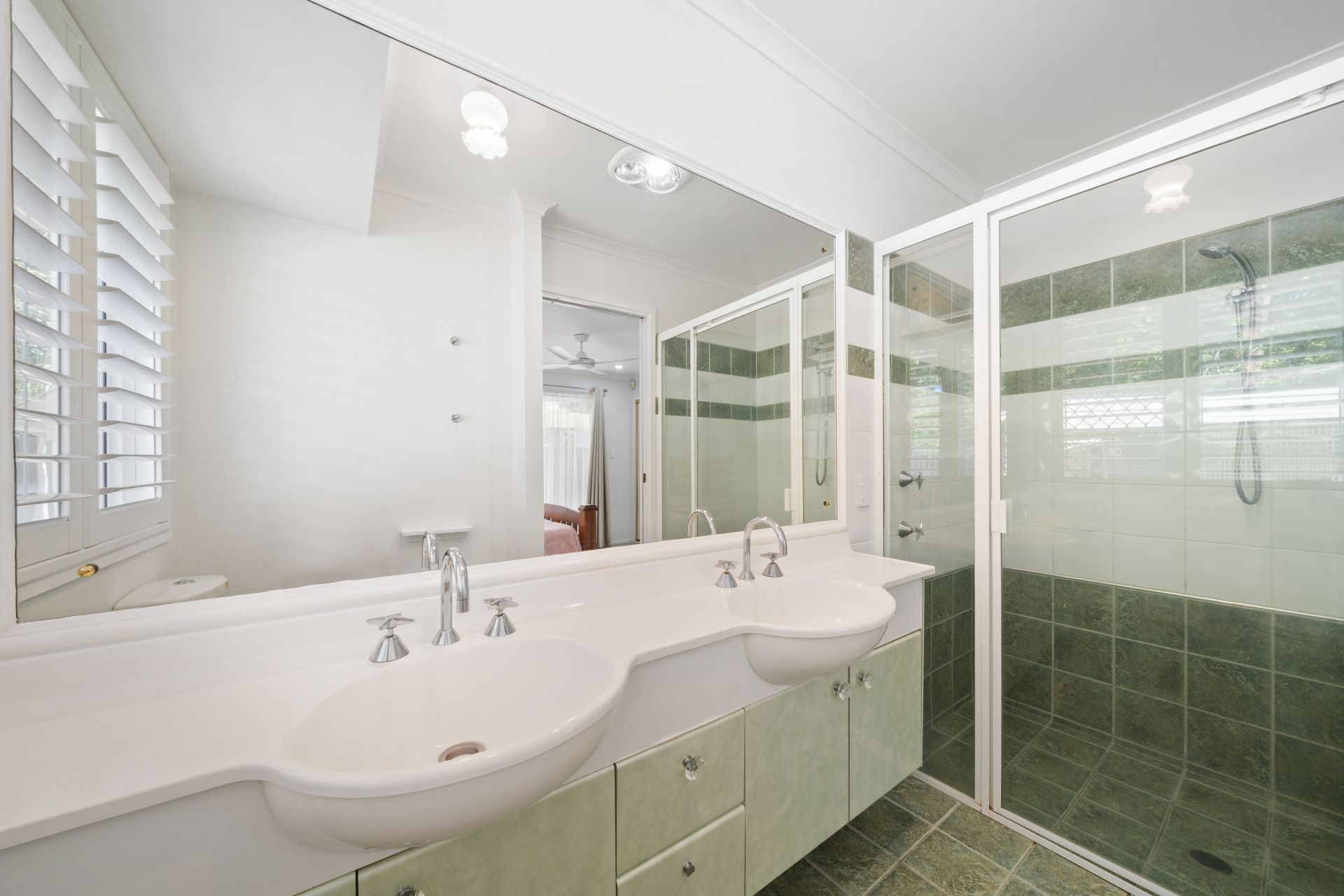 > The master ensuite features a spacious shower with detachable showerhead, large dual basin vanity with plenty of storage, large vanity mirror, towel hooks, extractor/light combo, sliding windows with security screens, plantation shutters and combined toilet.