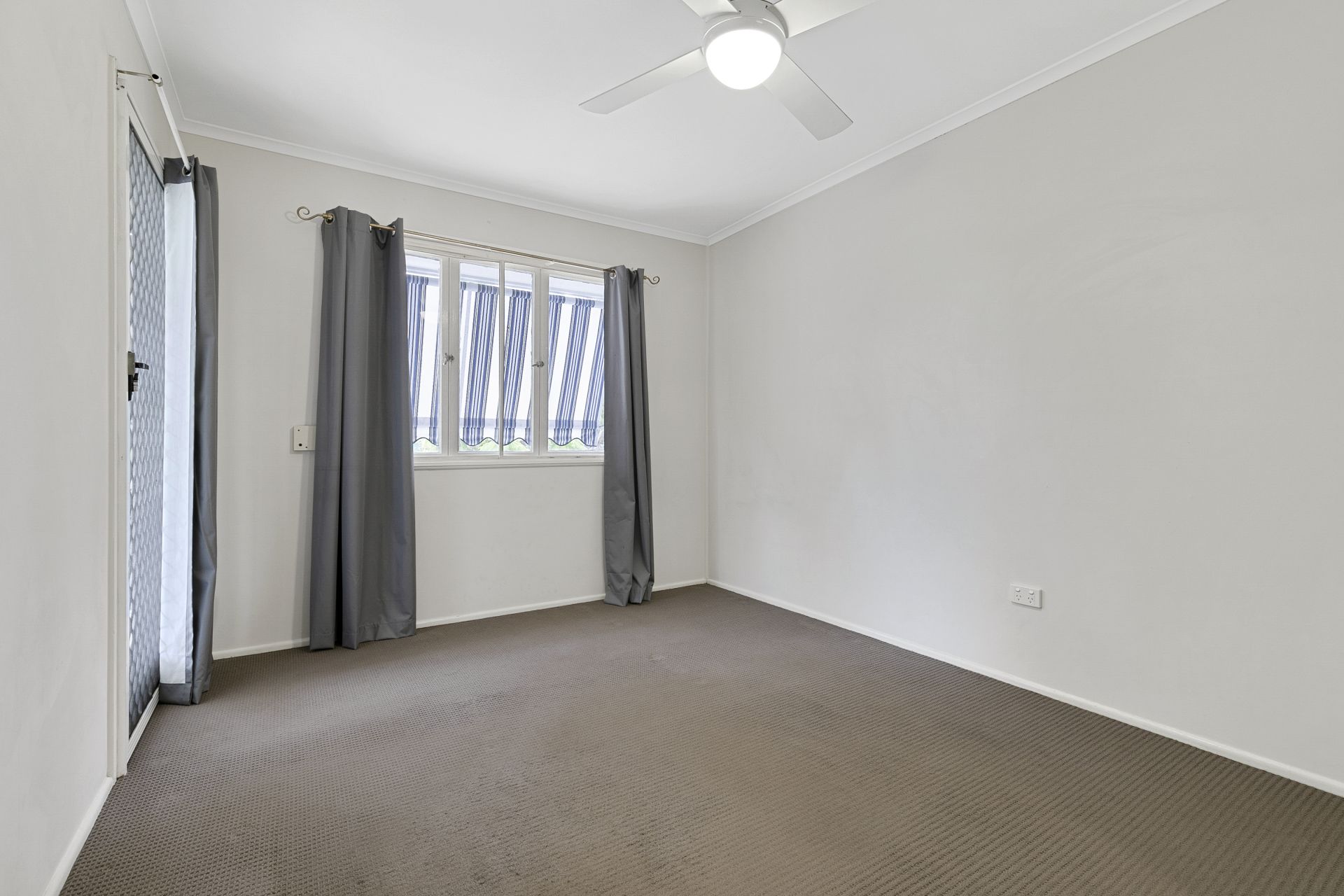 > Master features carpeted flooring, ceiling fan, built-in wardrobe, curtains, screens and access a shared balcony with bedroom 2