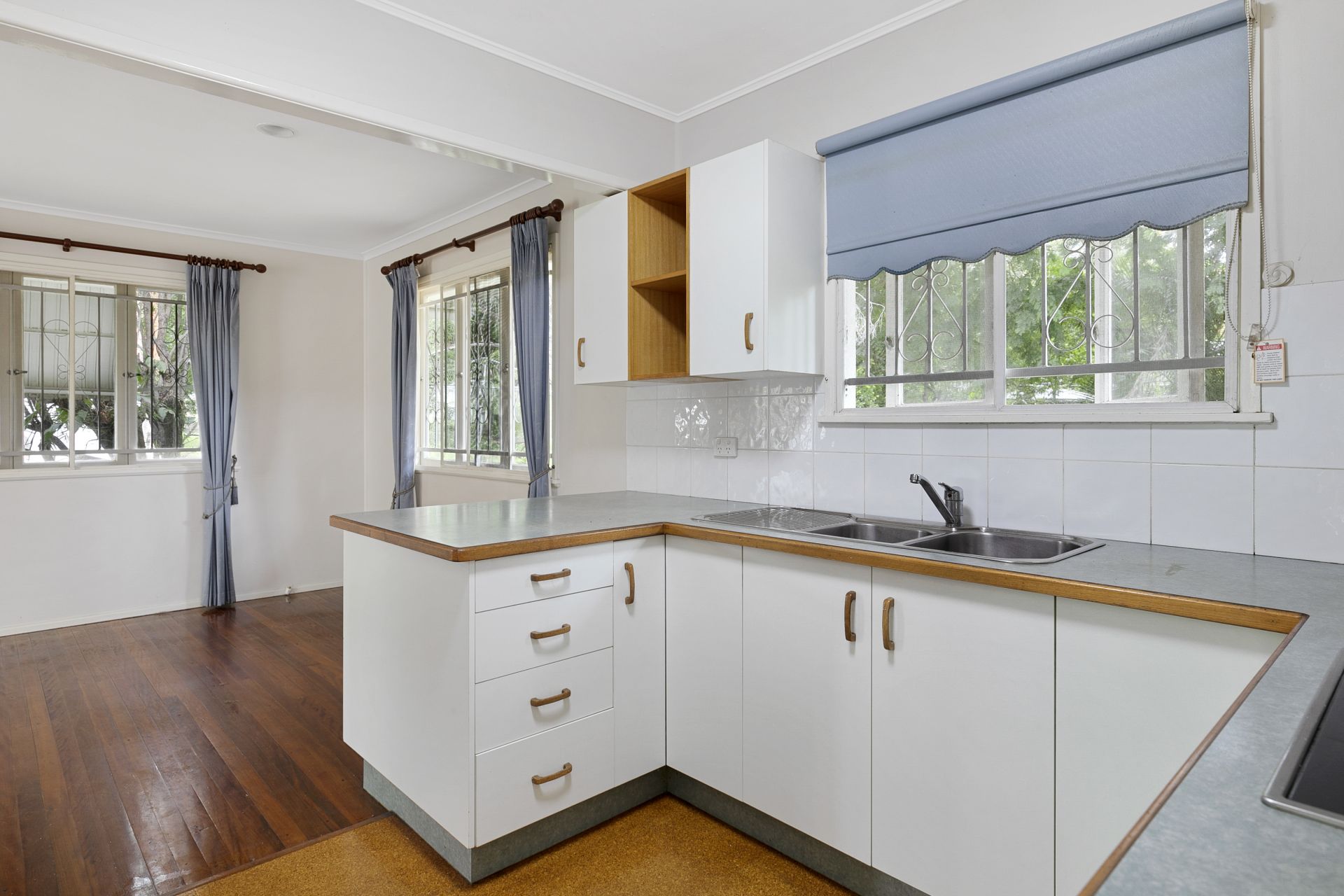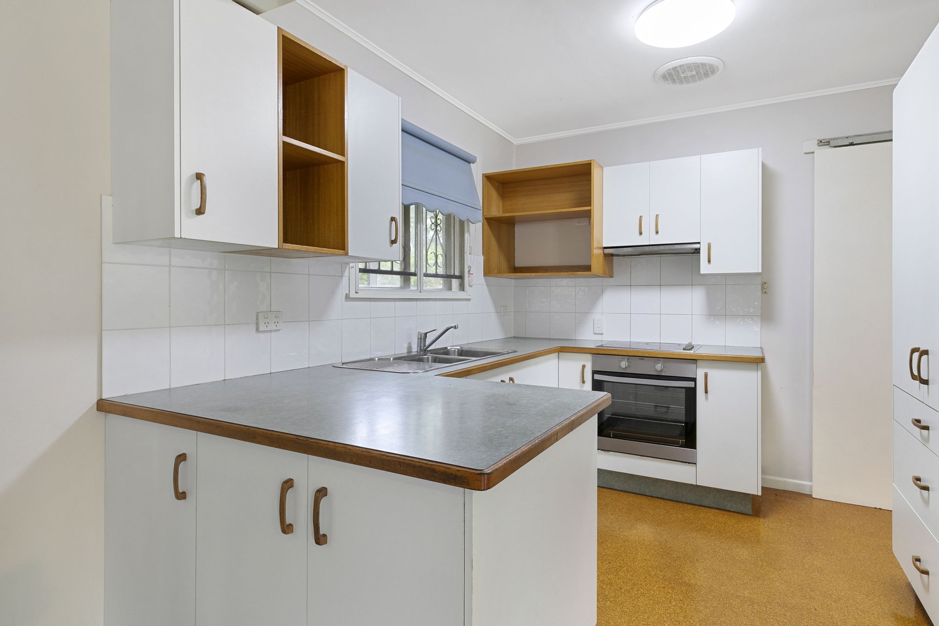 - Kitchen neatly tucked away at the back of the home with views of the backyard, cork flooring, laminate cupboards and benchtops, stainless steel oven and 4 burner cooktop.