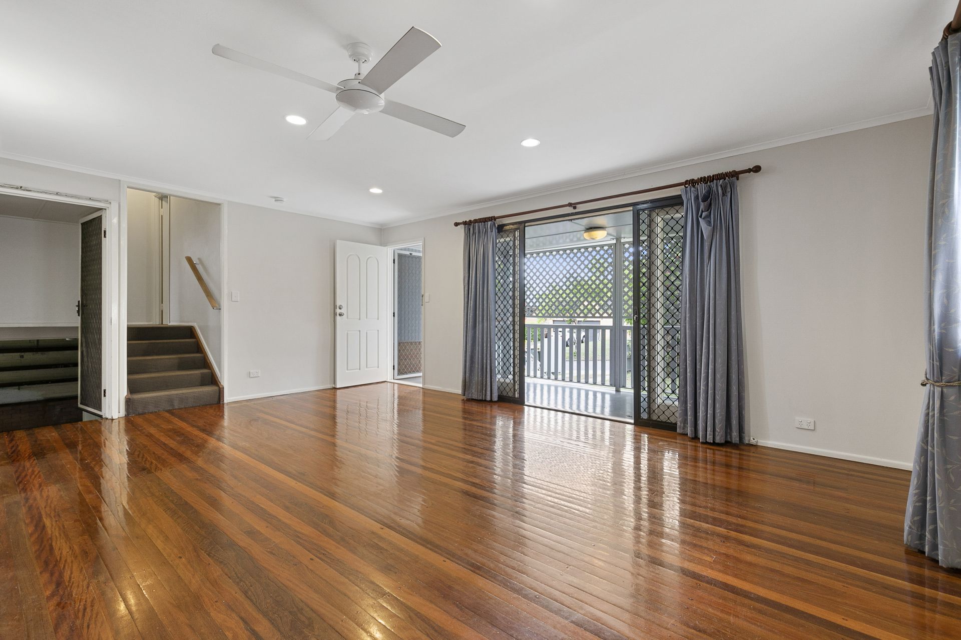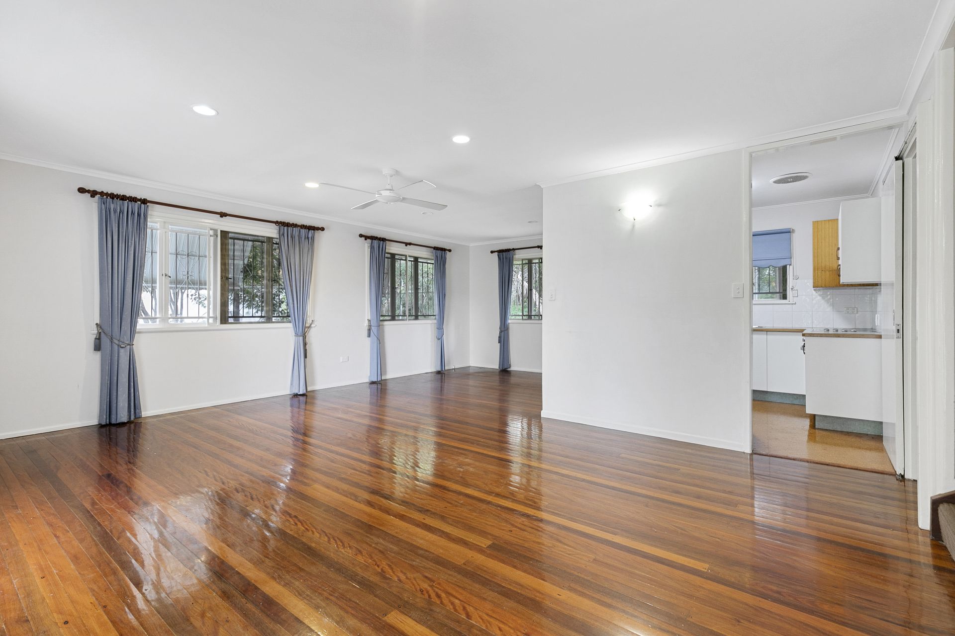 - Open plan lounge and dining with polished timber floors, curtains, screens, ceiling fan and opening to the enclosed porch overlooking the front yard.