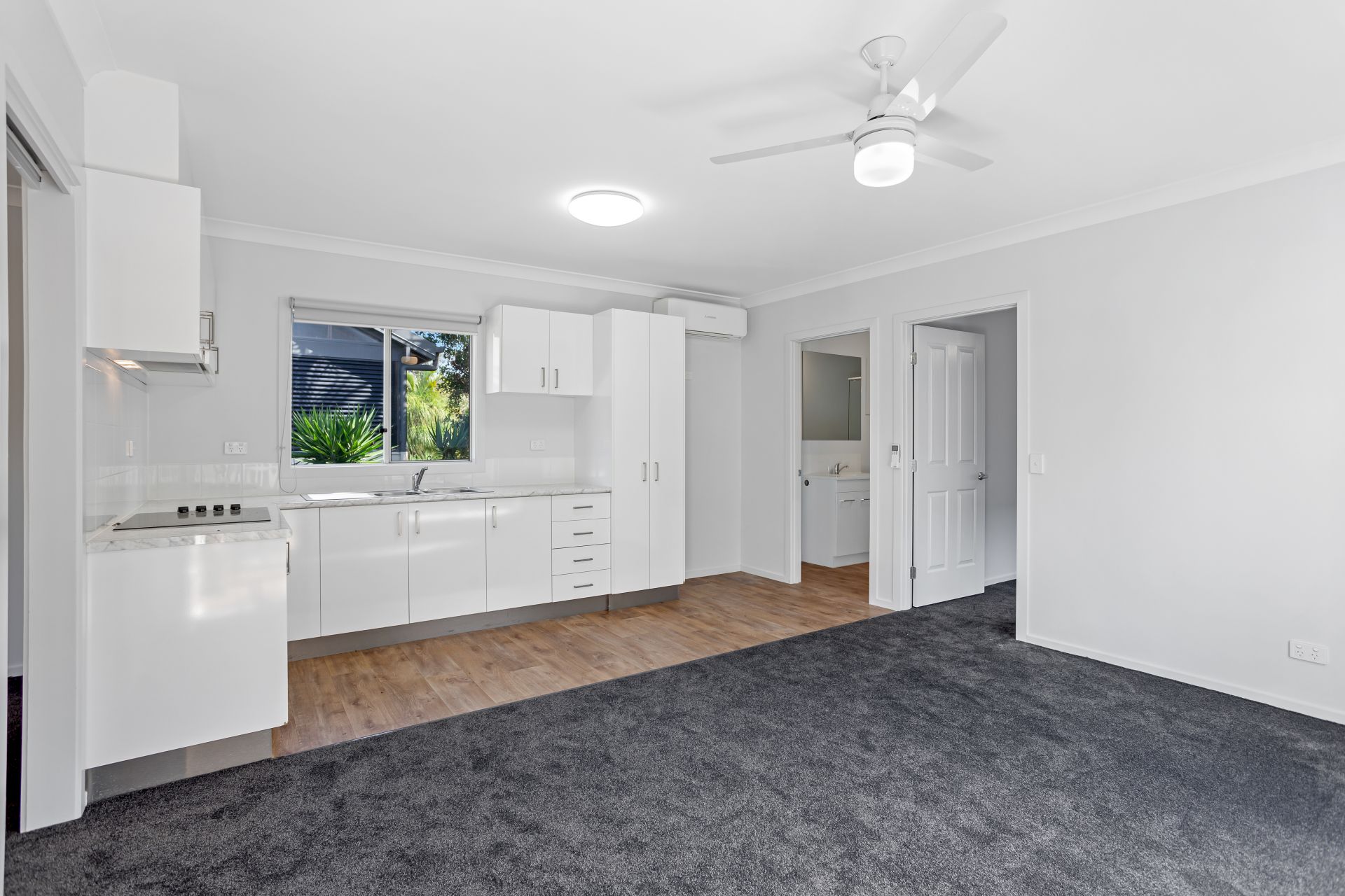 - Centrally located living area open to the dining space and kitchen, the living area features carpeted flooring, ceiling fan, screens, block-out roll-down blind and split system air-conditioning