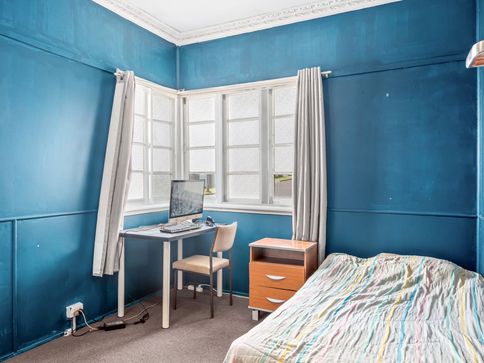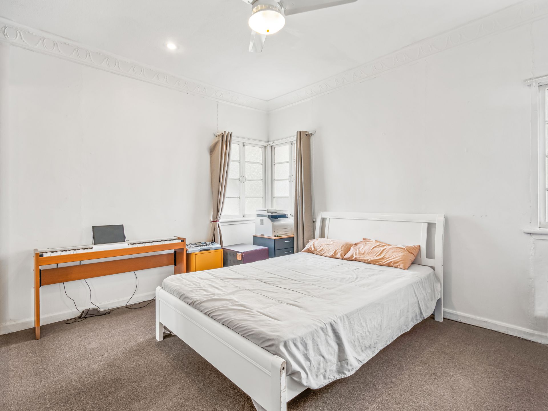 > Bedroom 3 boasts an extra high ceiling, ornate cornicing, carpet flooring, casement windows, curtains and in-fan lighting.