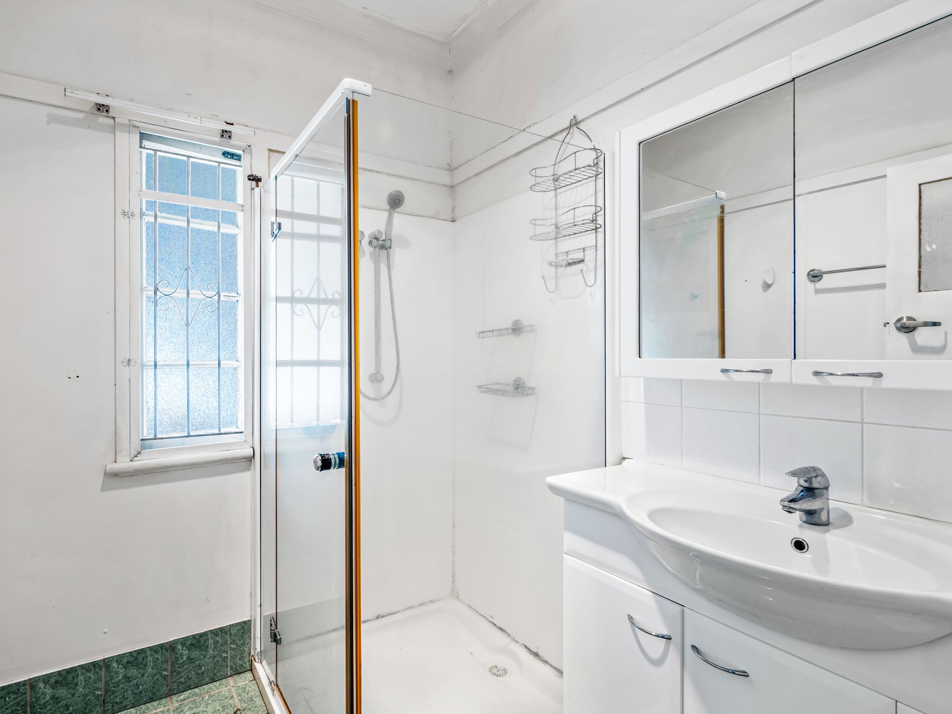 > The bathroom features a shower with detachable showerhead, single basin vanity with storage, wall mounted mirror cabinet, heat/light/extractor combo, frosted casement window with security bar and separate toilet.