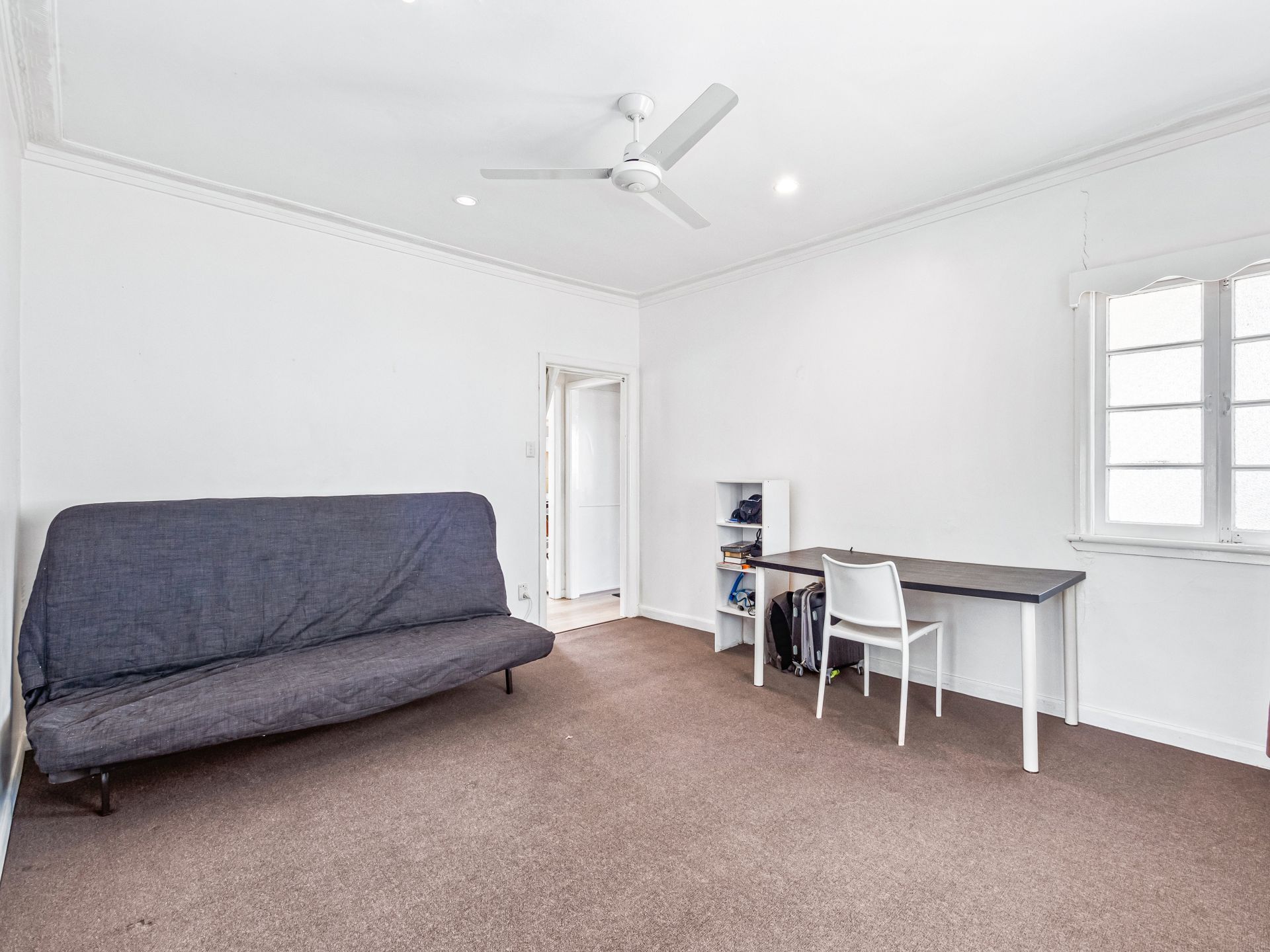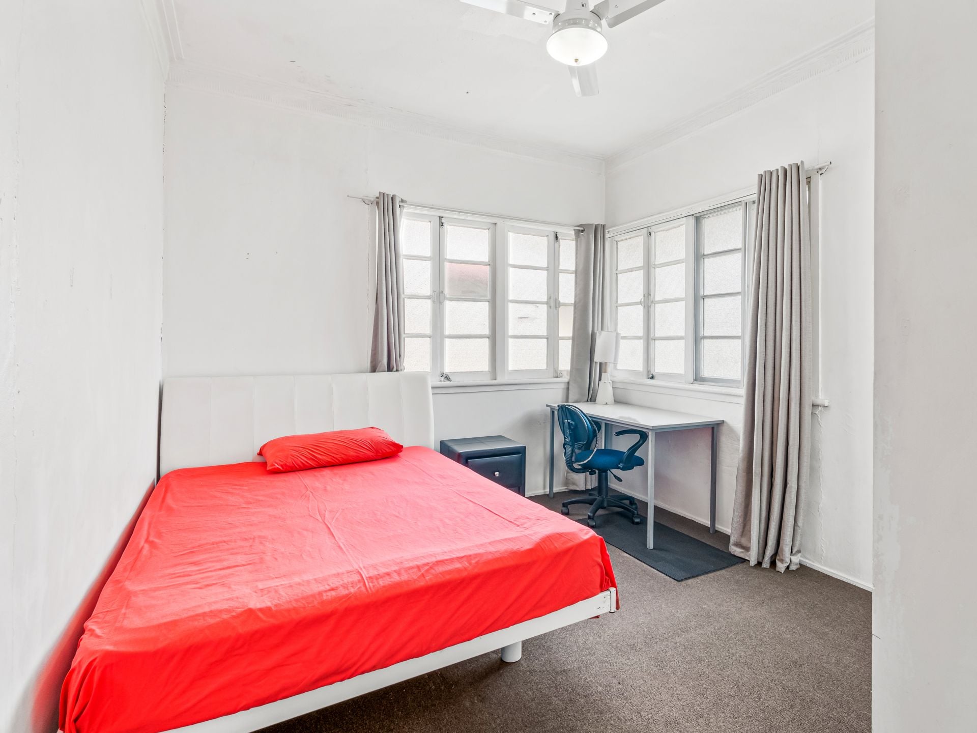 > Bedroom 2 boasts an extra high ceiling, ornate cornicing, carpet flooring, casement windows, curtains and in-fan lighting.