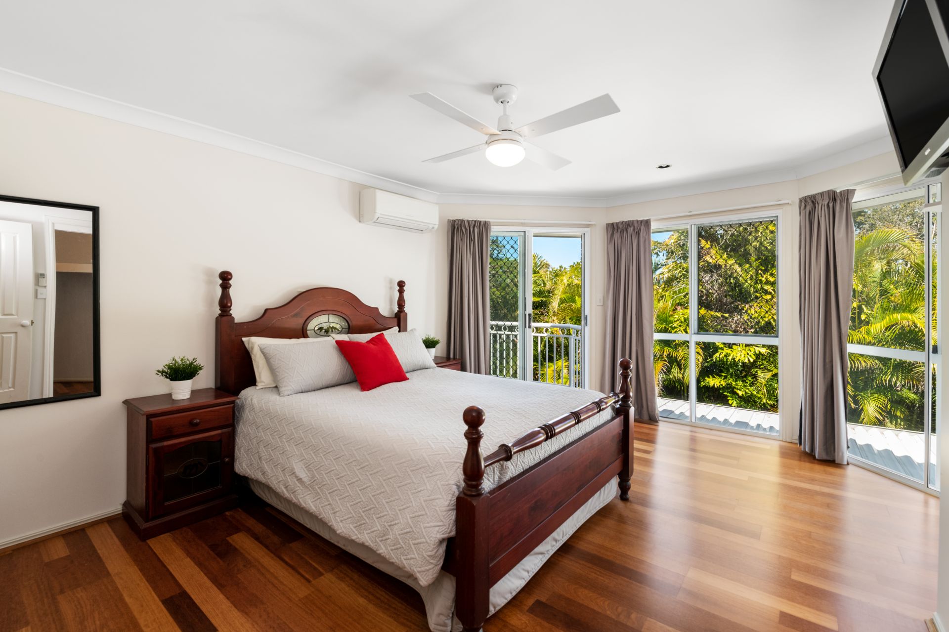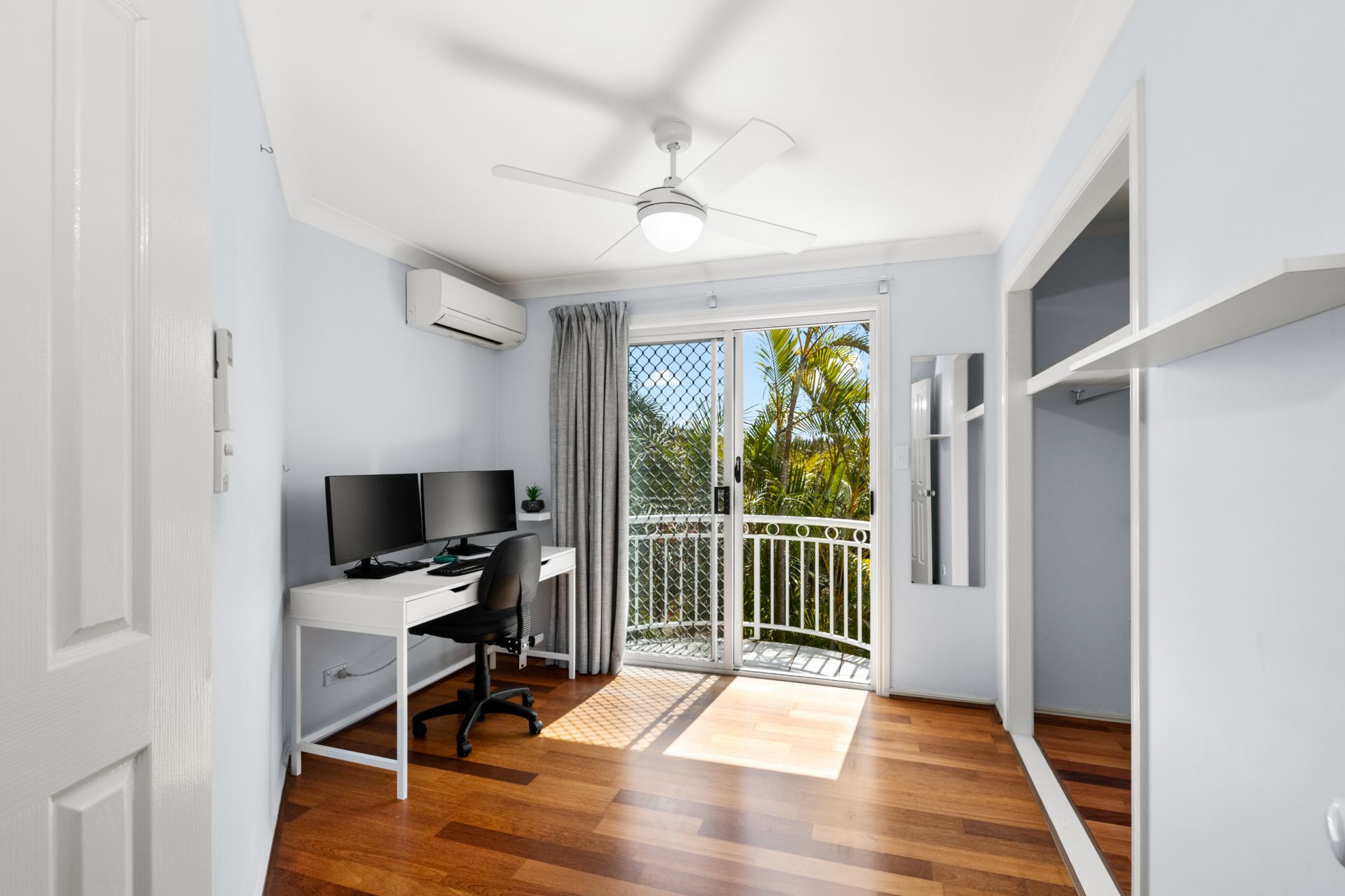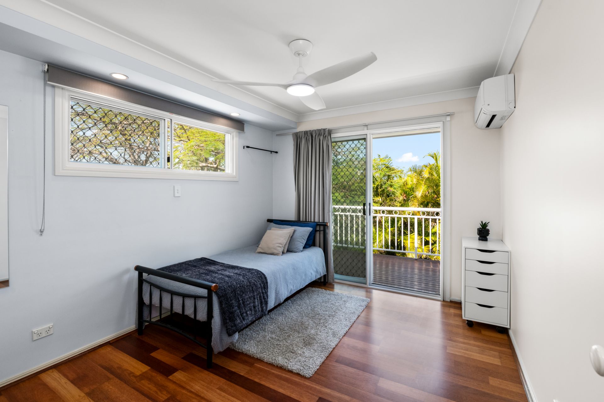 - Bedroom three features timber flooring, split-system air-conditioning, ceiling fan, built-in-robes, and private Juliette balcony.