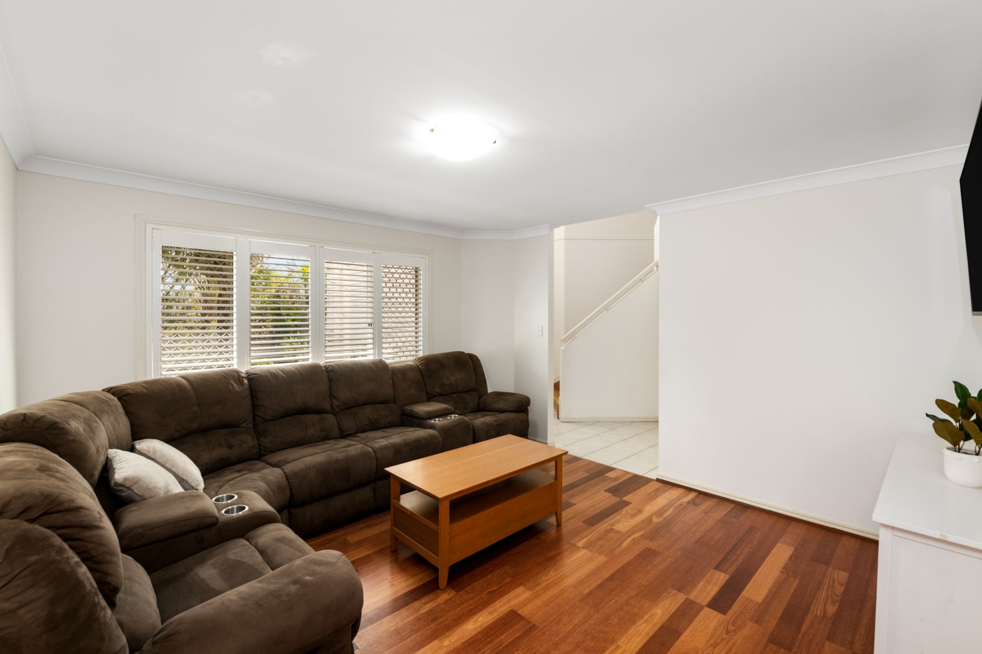 - Formal lounge and dining rooms share an open space and features timber flooring, split-system air-conditioning, and plantation shutters.
